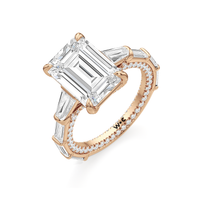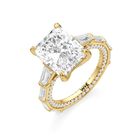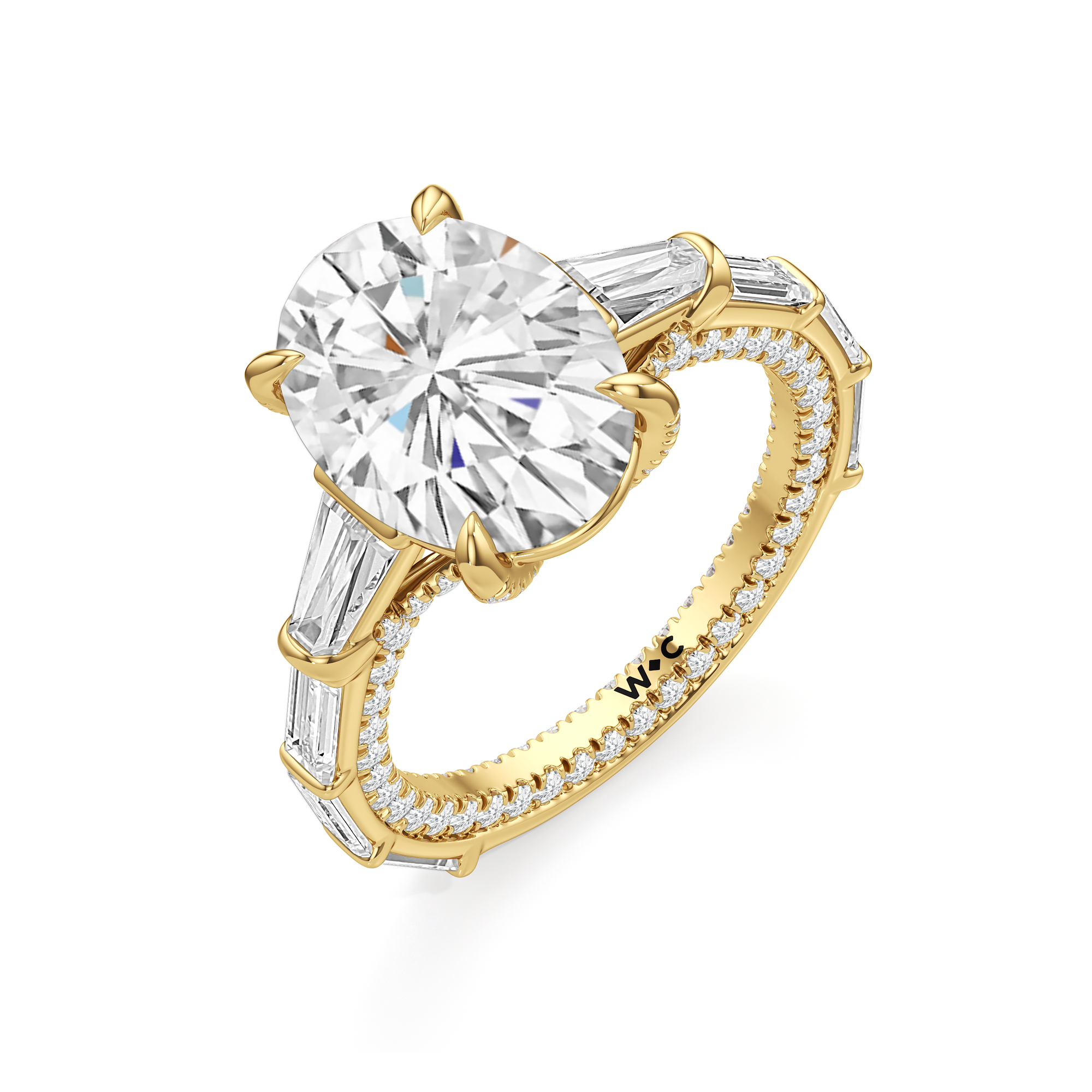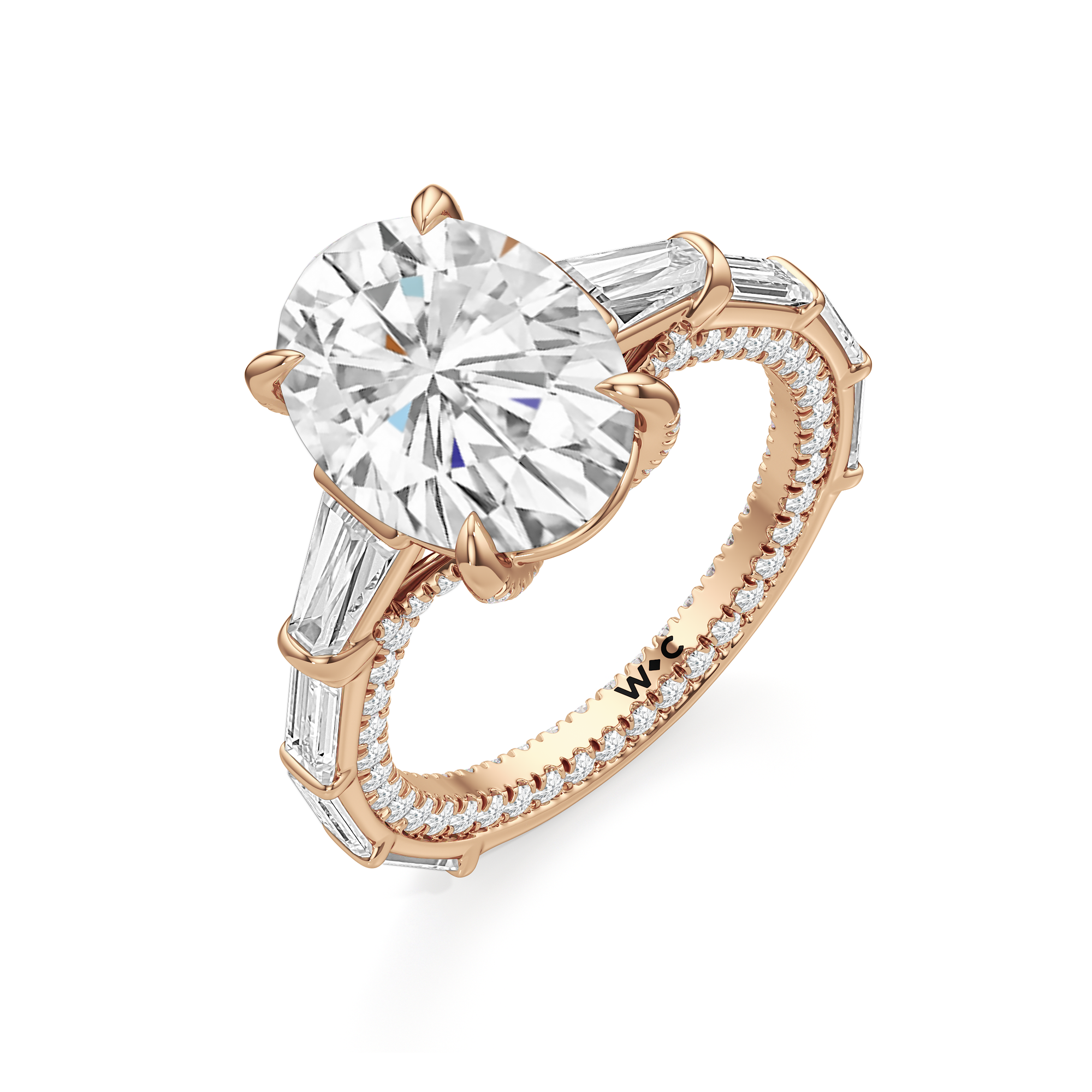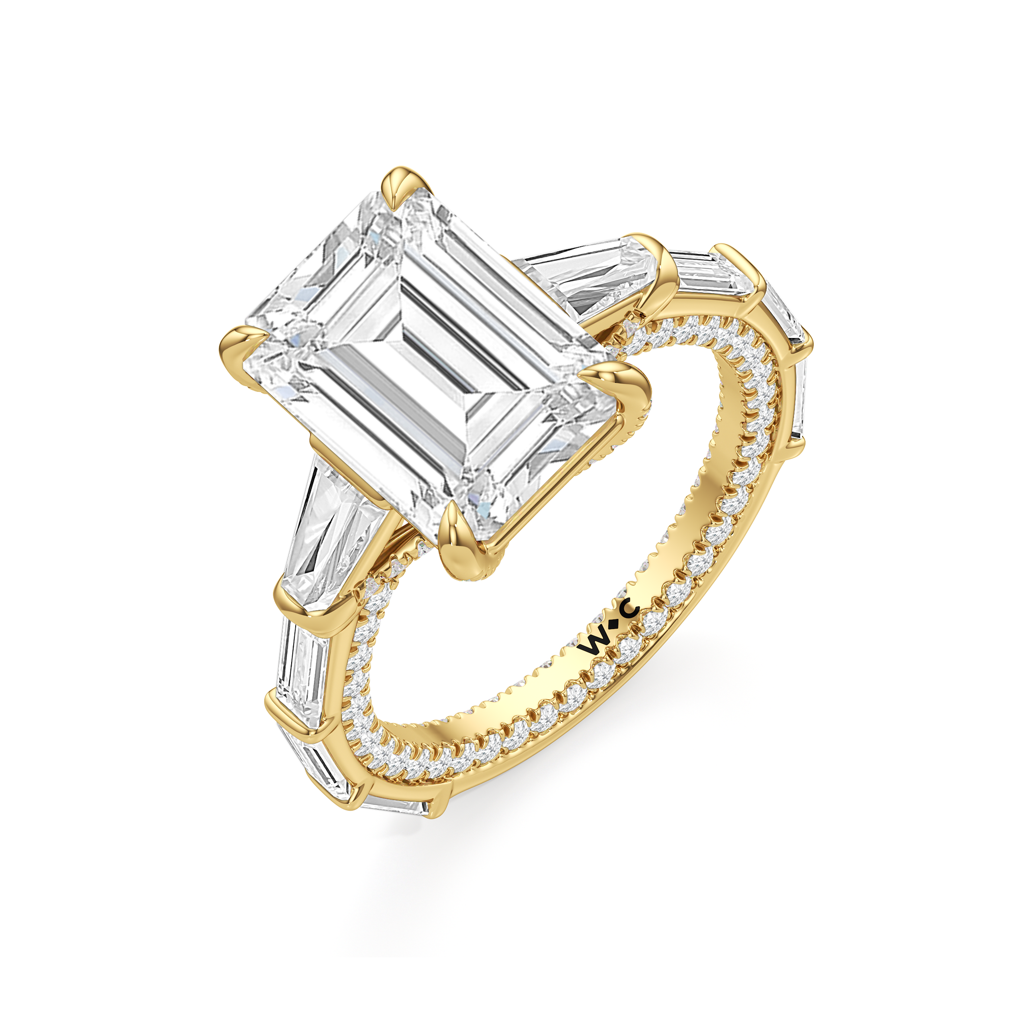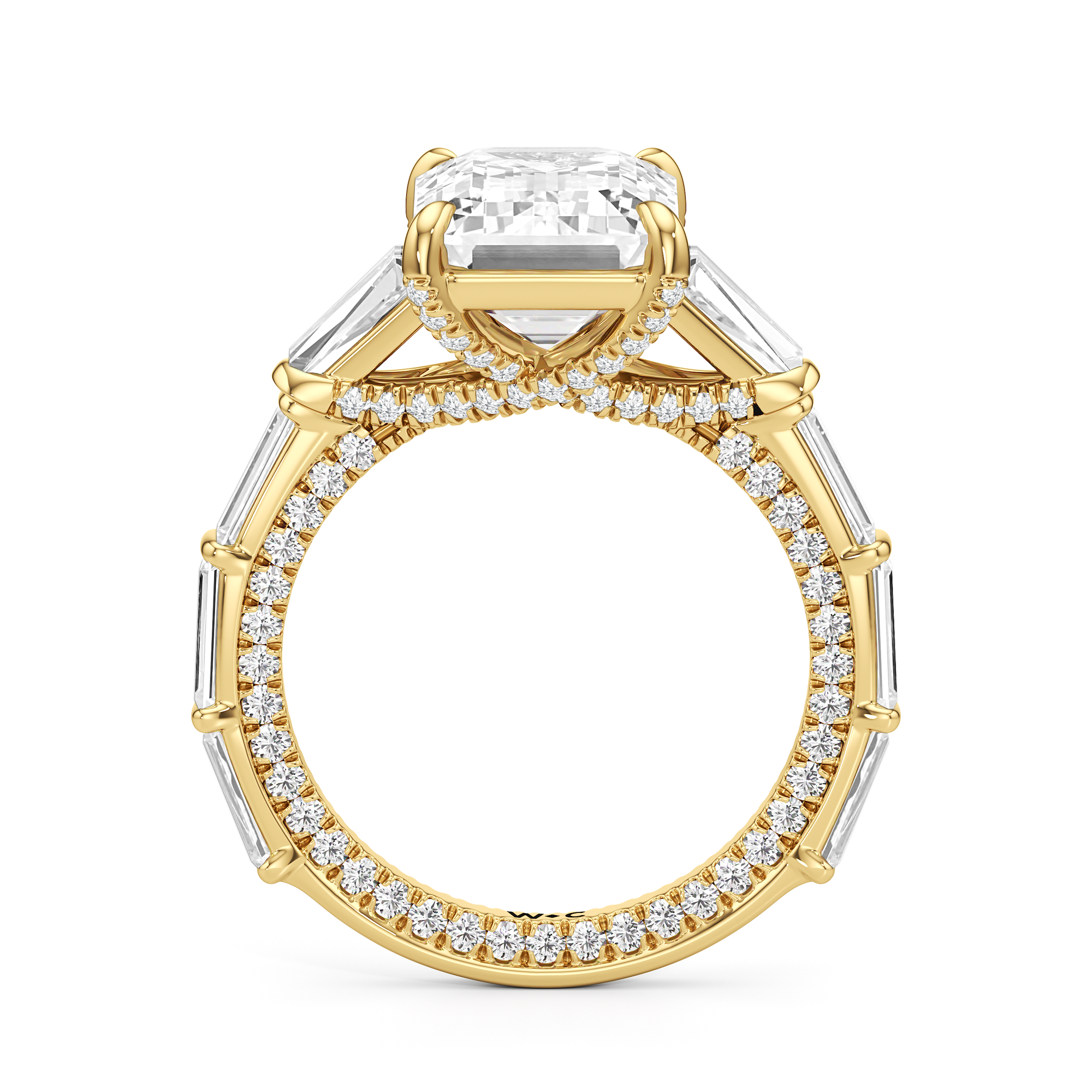 Statuesque but refined. Tapered baguettes flank the luminous center, tracing the shank in a continuous stream of light. From the side, petite round diamonds drape the gallery like fine lace, offering an ornate detail for the wearer alone.
