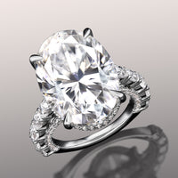 Experience the fusion of romance and nostalgia. This ring's pavé band leads to a sophisticated oval-cut diamond center stone. The central gem's rectangular, long facets are complemented by V-shaped prongs that are delicately outlined with petite round diamonds. To give the ring a subtle modern touch, the cathedral shank is given a knife-edge style.