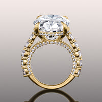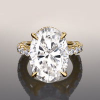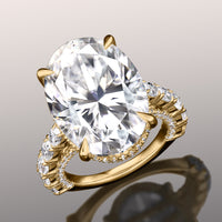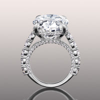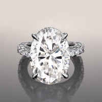 Experience the fusion of romance and nostalgia. This ring's pavé band leads to a sophisticated oval-cut diamond center stone. The central gem's rectangular, long facets are complemented by V-shaped prongs that are delicately outlined with petite round diamonds. To give the ring a subtle modern touch, the cathedral shank is given a knife-edge style.
