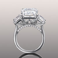 Intertwine refined design with regal charm. This sleek three-stone ring features a trio of emerald-cut diamonds. It encompasses a large and impressive center, flanked by two side stones with enduring strength. The bright, icy-white emerald-cut stones are held securely in place by prongs, anchored by a lotus gallery. Tiny round diamonds trace the bridge for a scintillating finish.