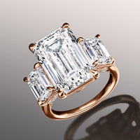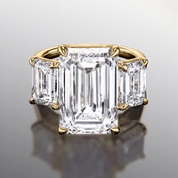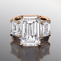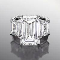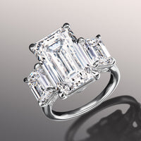Intertwine refined design with regal charm. This sleek three-stone ring features a trio of emerald-cut diamonds. It encompasses a large and impressive center, flanked by two side stones with enduring strength. The bright, icy-white emerald-cut stones are held securely in place by prongs, anchored by a lotus gallery. Tiny round diamonds trace the bridge for a scintillating finish.