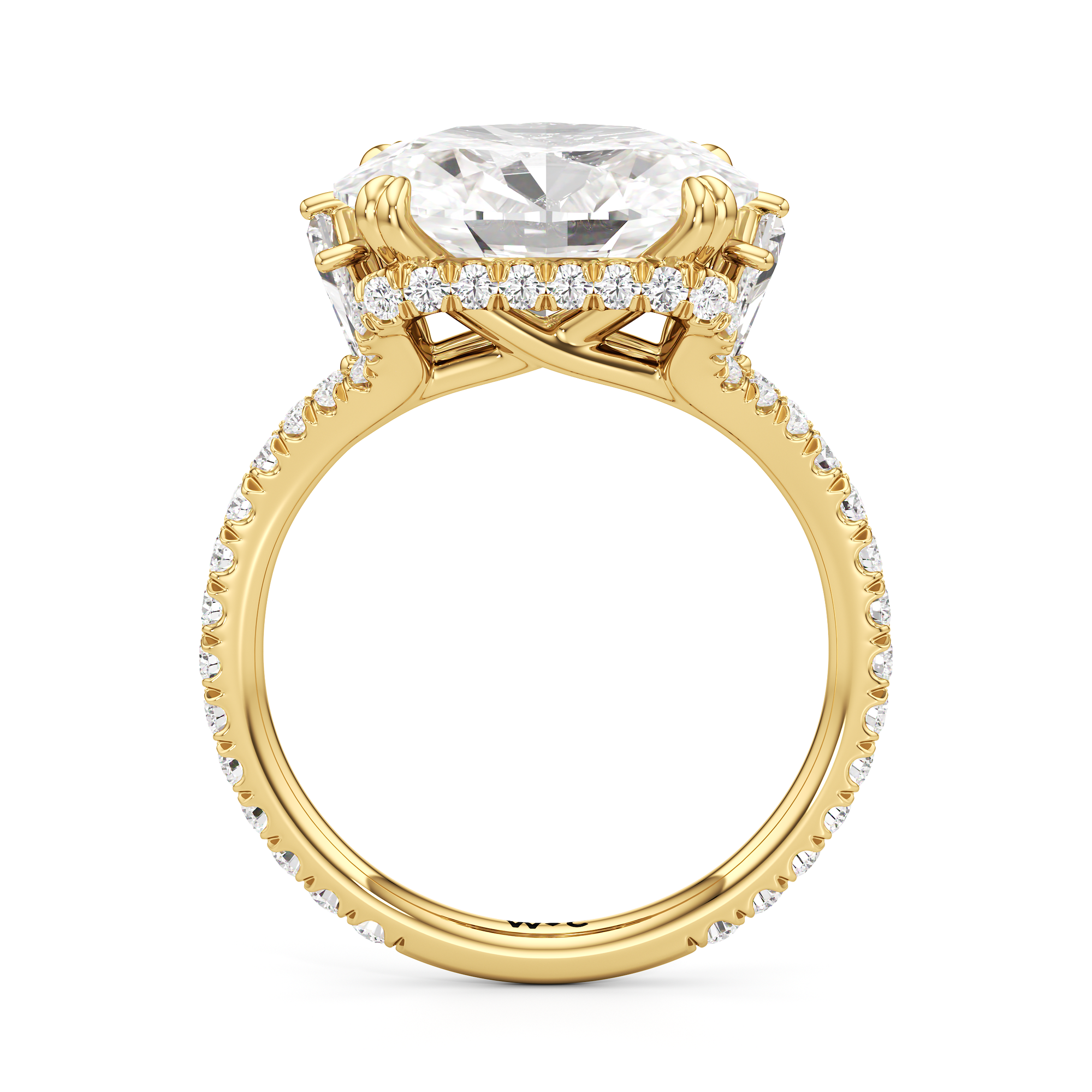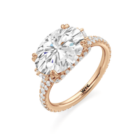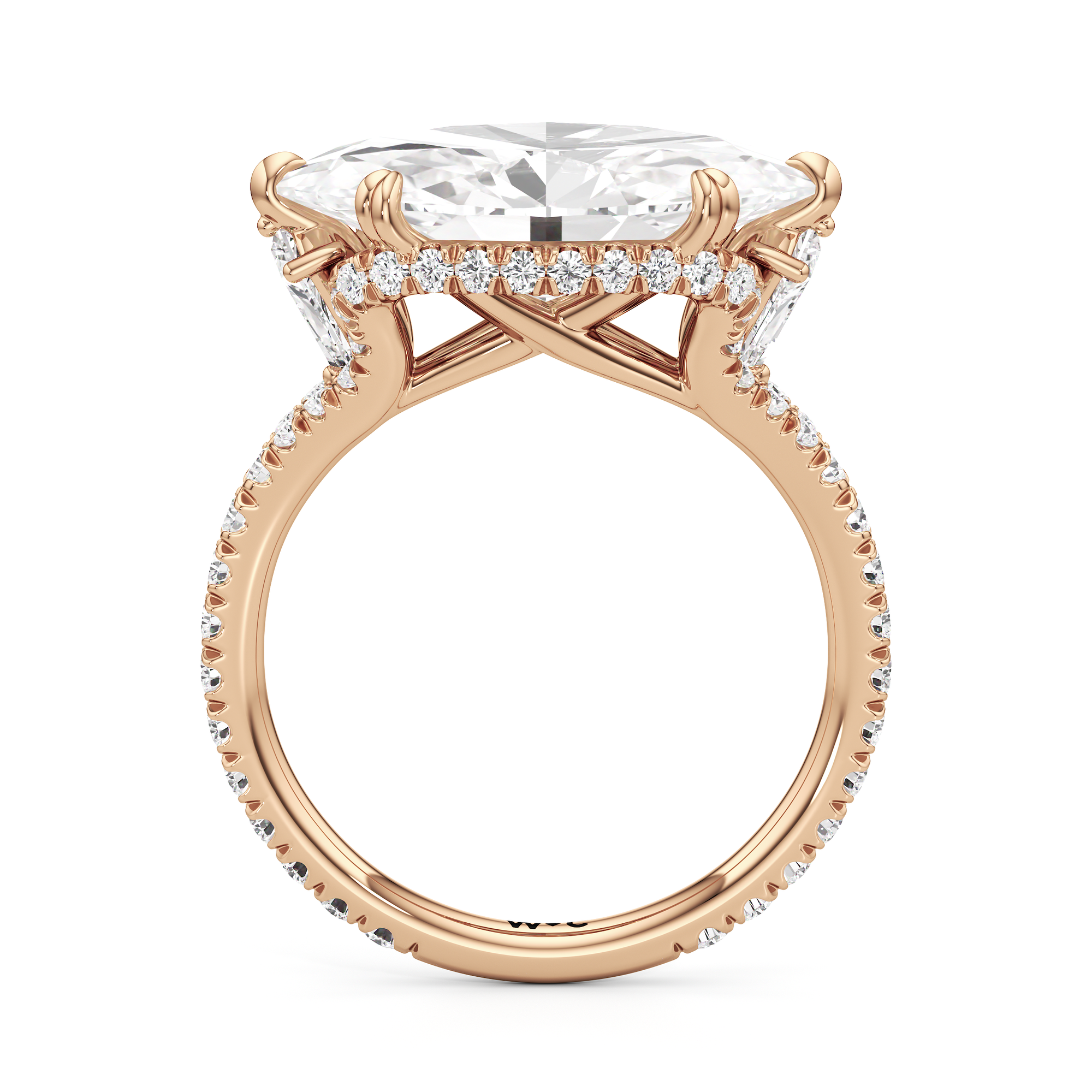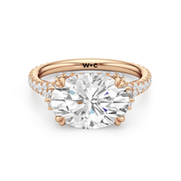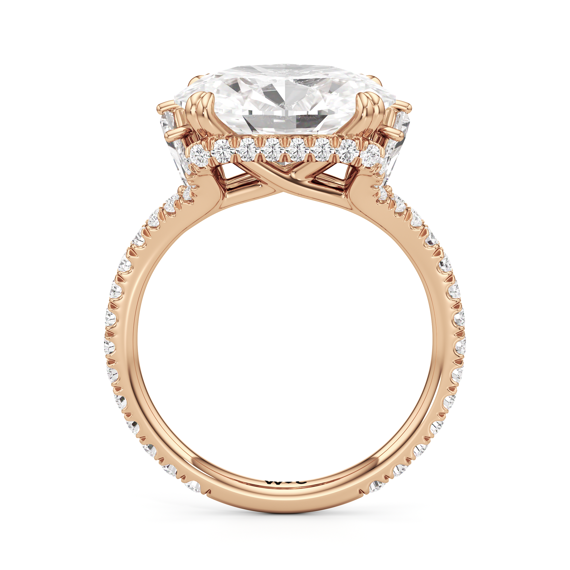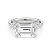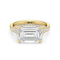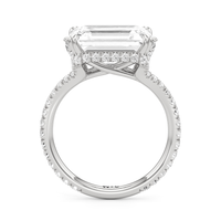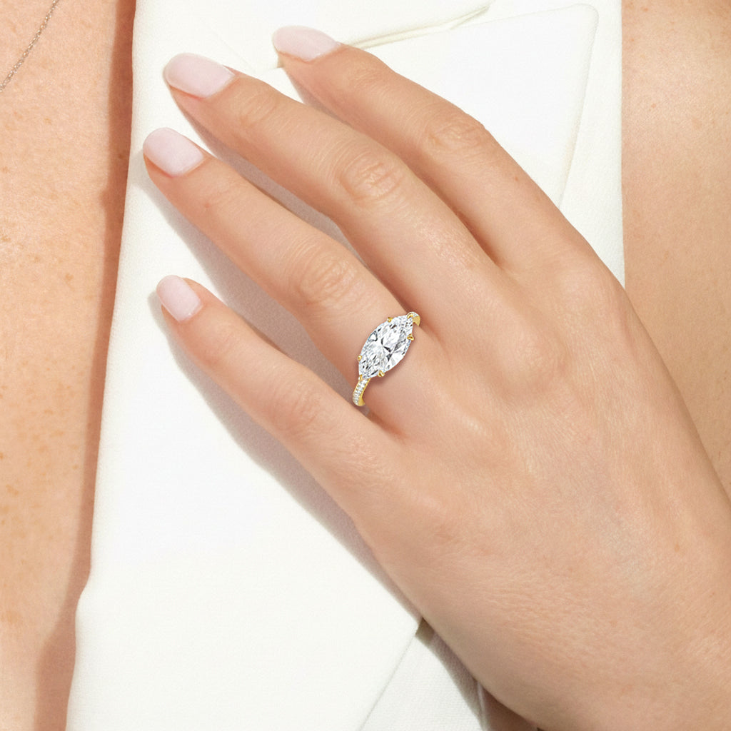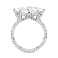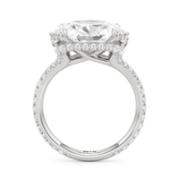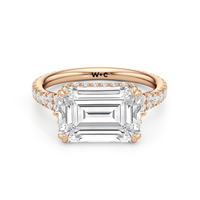This elegant east–west set ring features a center stone secured by four refined prongs that crossover from the bridge, creating a striking architectural detail. Extended arms from the shank cradle the center stone, adding both stability and visual interest. The pavé-set shank enhances the design with continuous sparkle, drawing the eye toward the center while maintaining a sleek, modern profile.