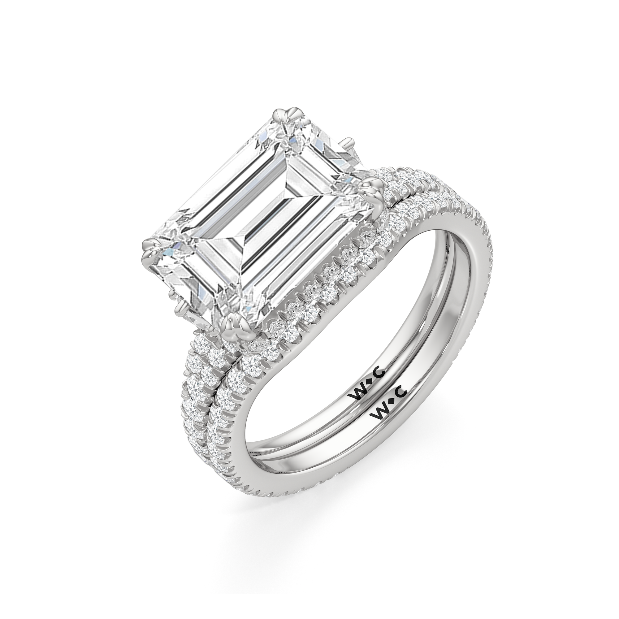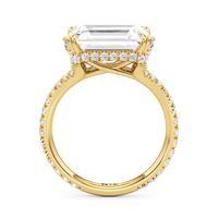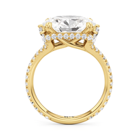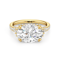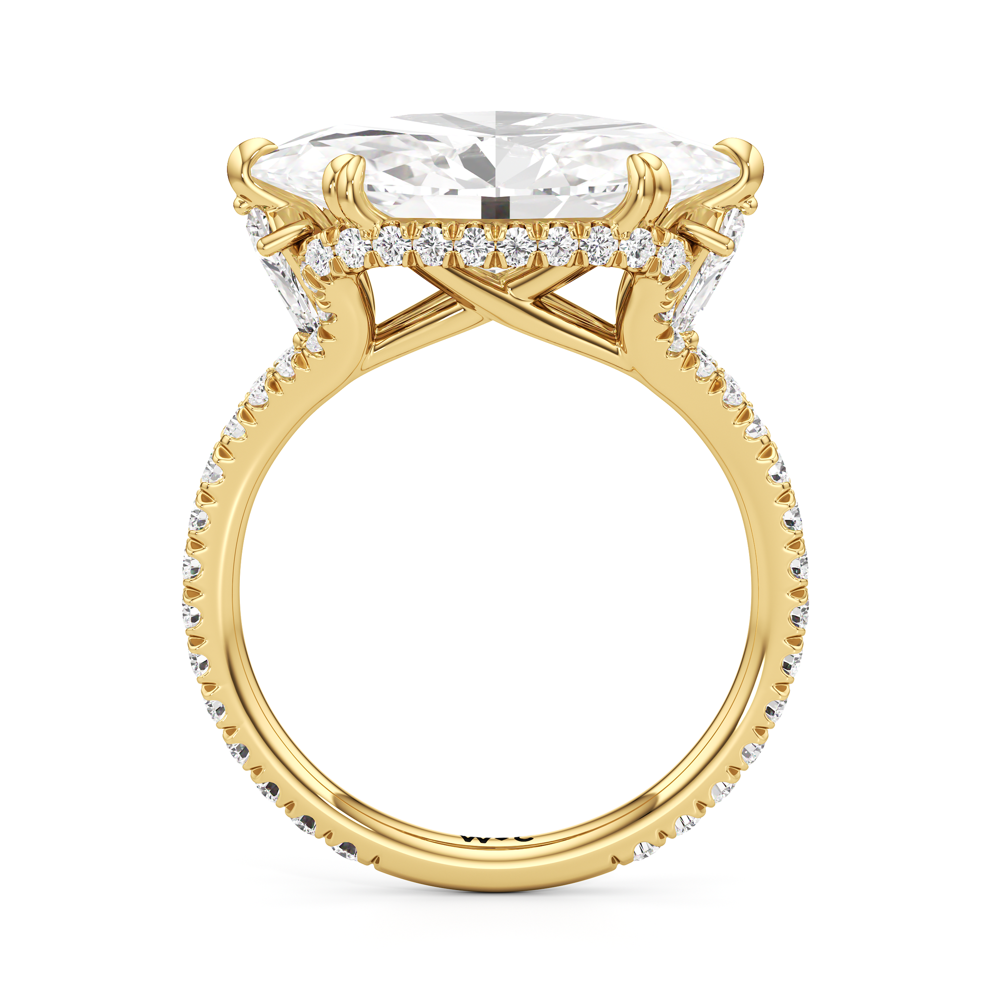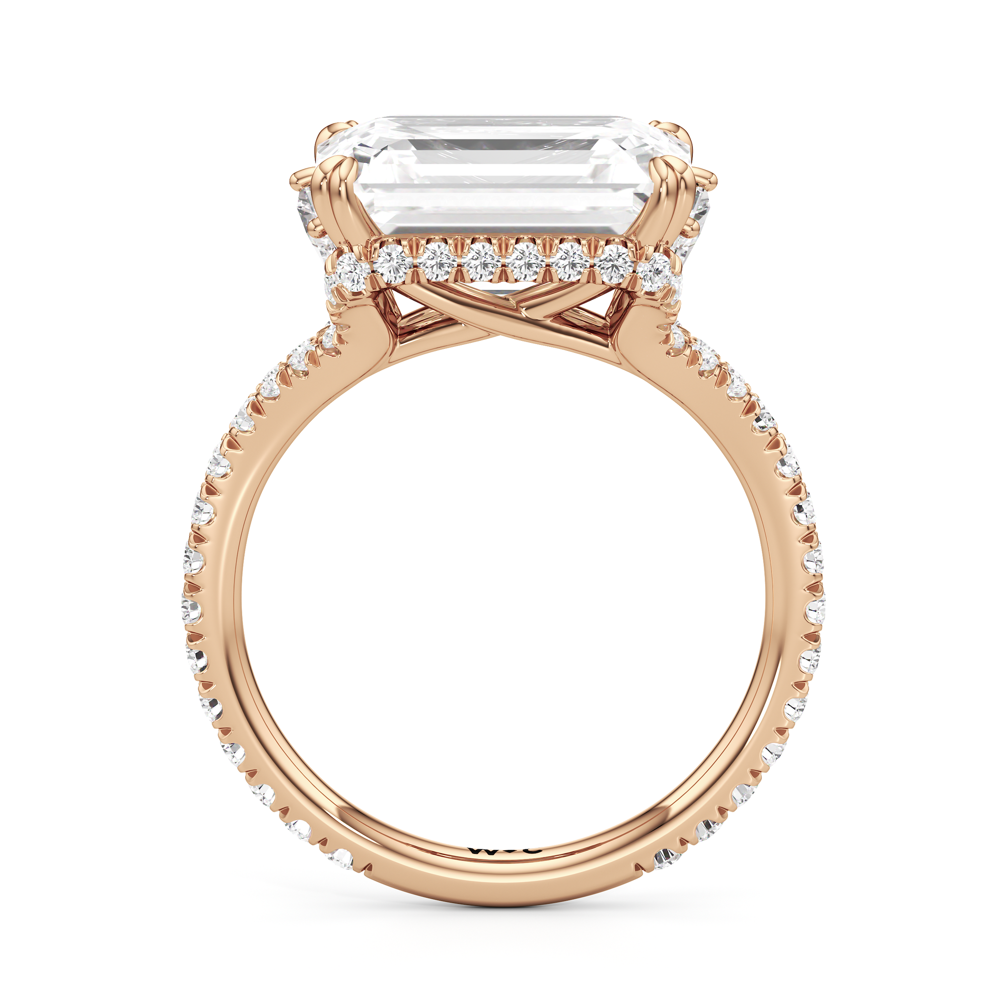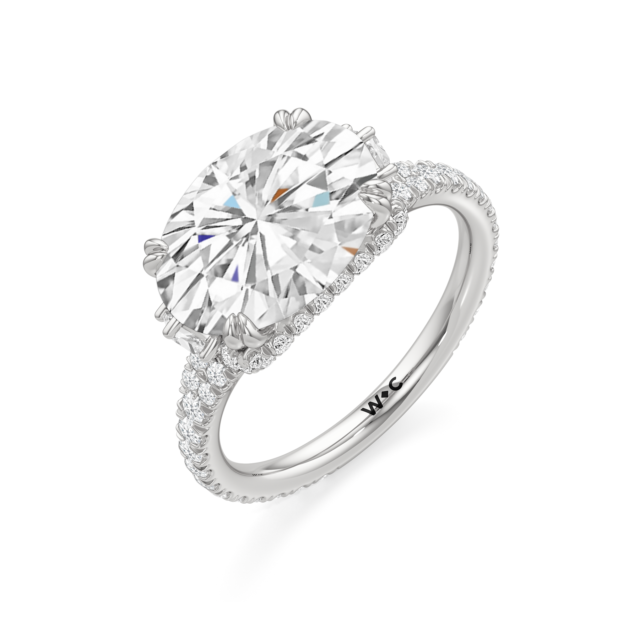 This elegant east–west set ring features a center stone secured by four refined prongs that crossover from the bridge, creating a striking architectural detail. Extended arms from the shank cradle the center stone, adding both stability and visual interest. The pavé-set shank enhances the design with continuous sparkle, drawing the eye toward the center while maintaining a sleek, modern profile.