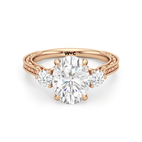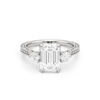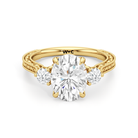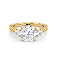 Marcelline carries elegance with quiet command. Its cathedral shoulders rise to meet a vintage-inspired three-stone centerpiece, with each diamond set in a sculpted tulip basket. Three bezel-set peekaboo diamonds add nuance, while fine engraving along the shank offers old-world refinement.