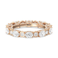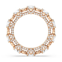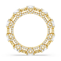 A meaningful ring to represent your everlasting love. This diamond eternity band in white gold features alternating bezel-set round diamonds and prong-set oval diamonds. Extra petite round diamonds trace the prongs and the side edge of the band. A glittering pattern can be seen when the ring is viewed from the side.
