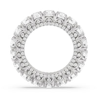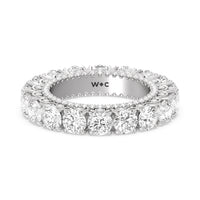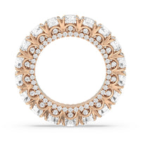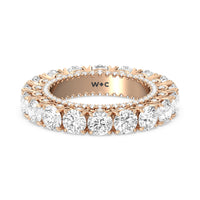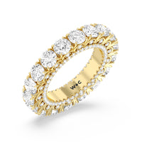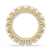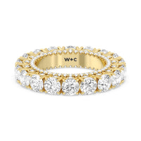 Just like the radiant sunshine, this yellow gold eternity ring bursts with brilliance. The elegant ring features shared split prongs in a well-defined pattern securing a never-ending circle of round diamonds. A view from the sides showcases more petite round diamonds tracing the entire circumference of the ring.