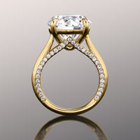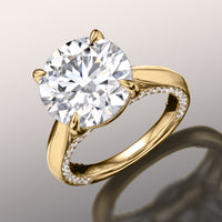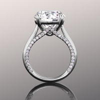 Intertwine luxury with understated style. This ring features a classic cathedral shank with stylized knife-edge shoulders that support a four-prong basket. Cradled right at the top-center of the band is a showstopping diamond center stone. A view from the ring's sides reveals more round diamonds lined up in a decorative chevron outline.