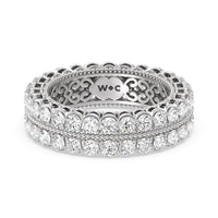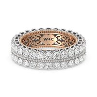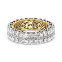 Rich in detail and sparkle, this ring beautifully evokes the splendor of a bygone area. The eternity ring features never-ending glitter with its three continuous rows of diamonds. At the center features alternating emerald-cut and round diamonds bordered on either side by petite round diamonds. Framing the band's sides are golden milgrain detailing for a truly vintage-inspired finish.