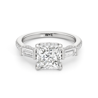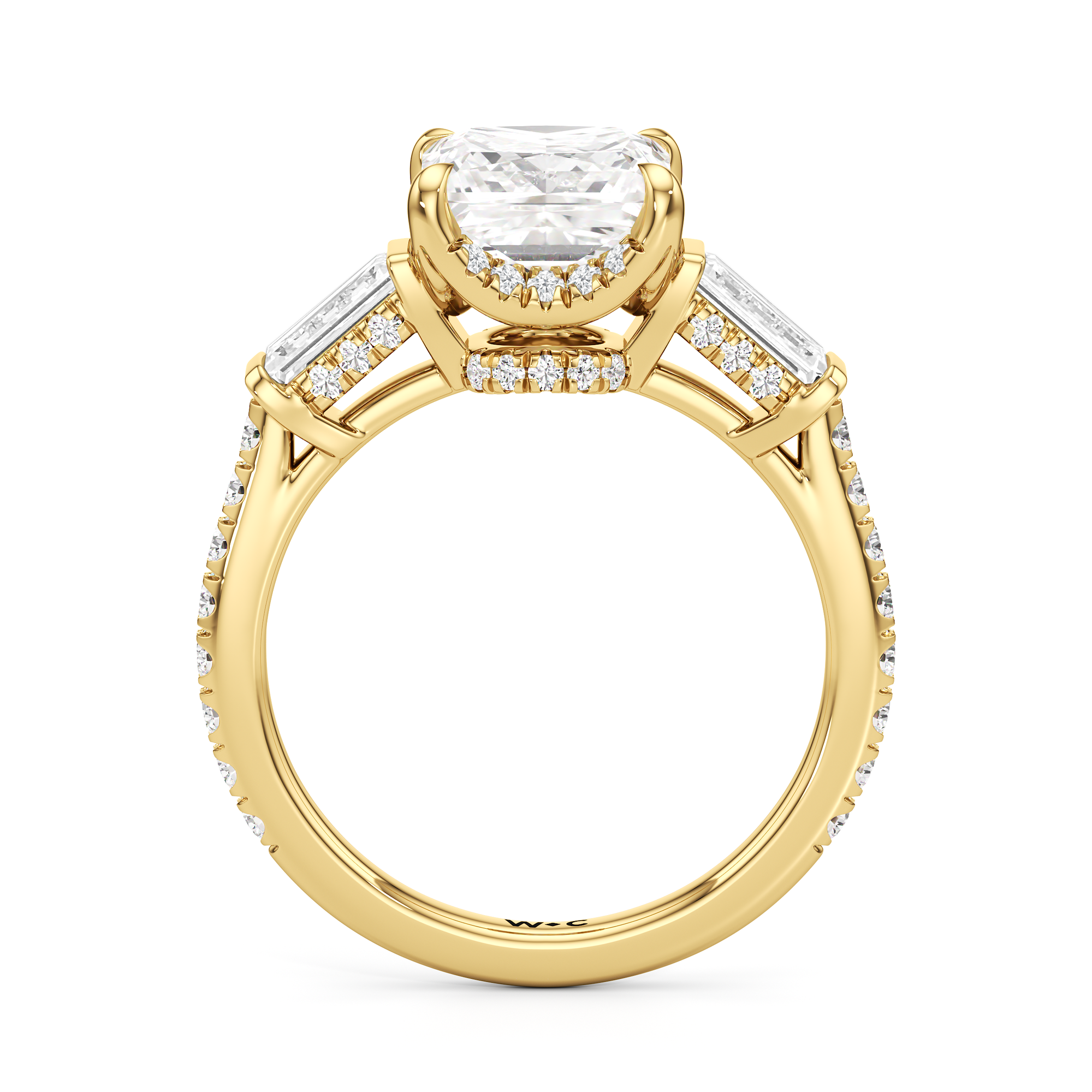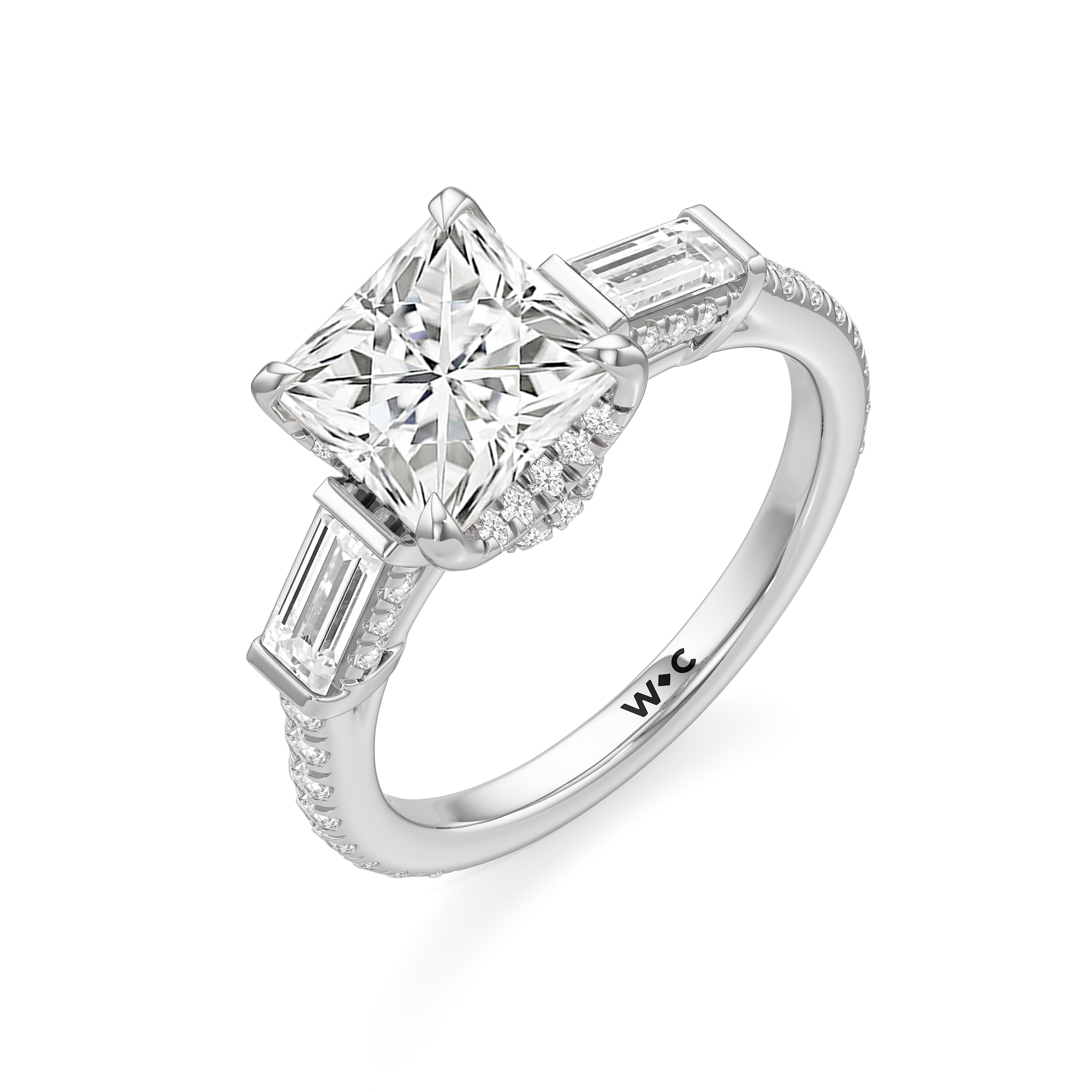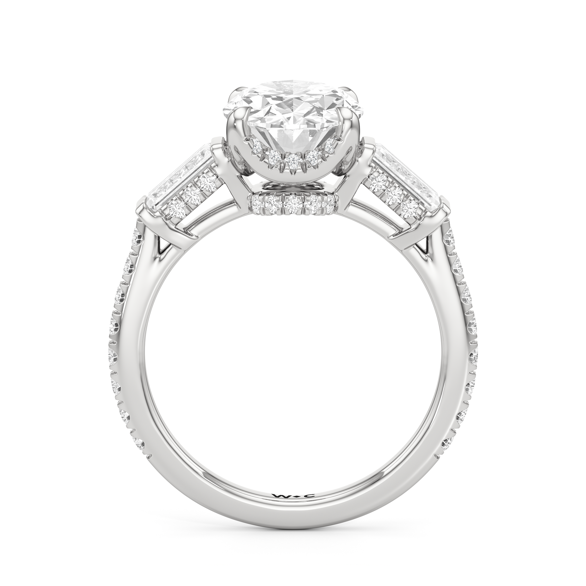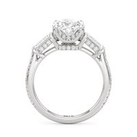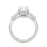 A contemporary classic. The ring reinterprets the traditional three-stone silhouette with a focus on sculptural grandeur. A center stone is held by four prongs and flanked by the sharp, mirrored flash of baguette diamonds. Secret rows of diamonds are tucked beneath each side stone and along the bridge. This hidden brilliance, paired with a diamond-set shank, ensures a continuous luster from every perspective.