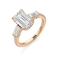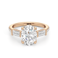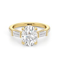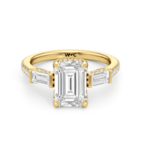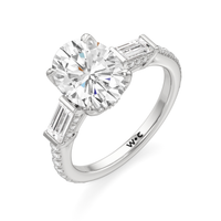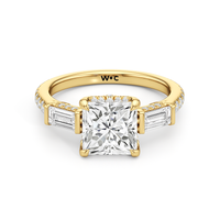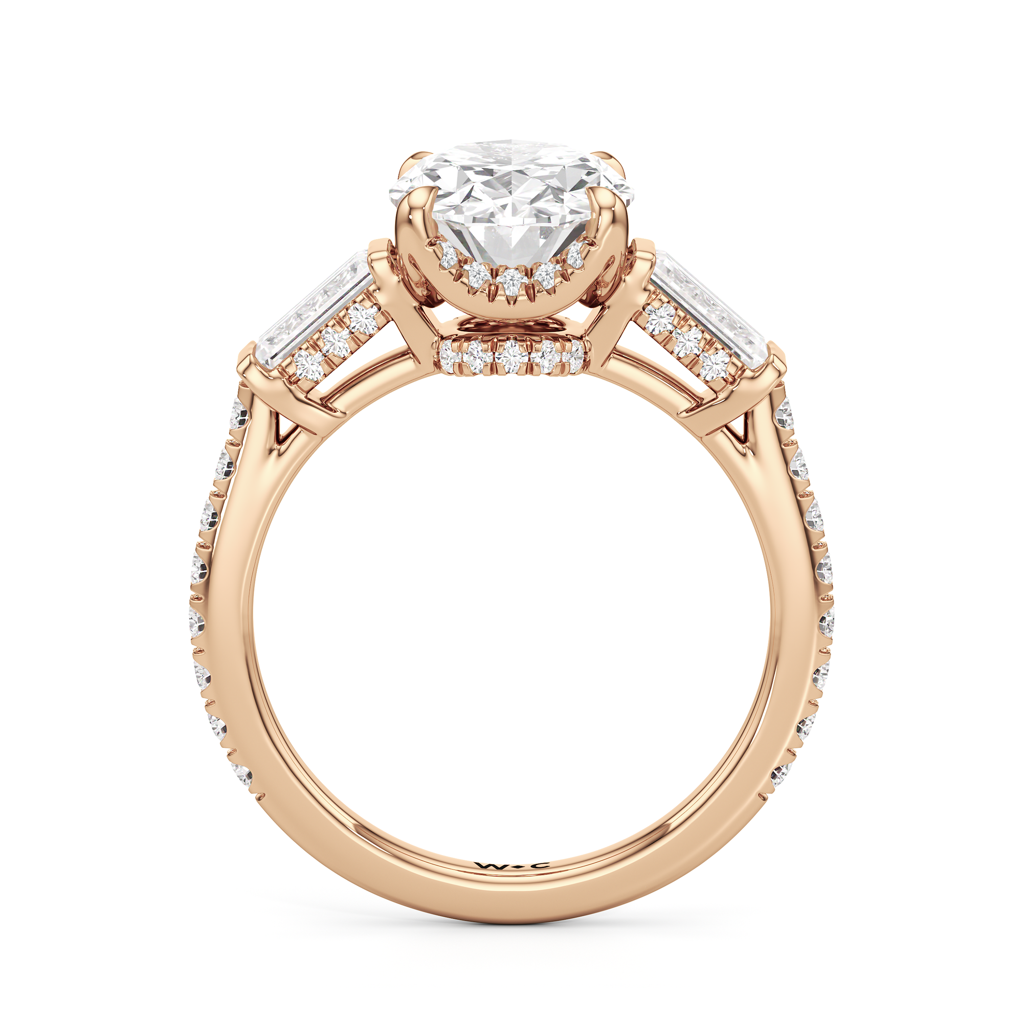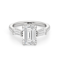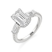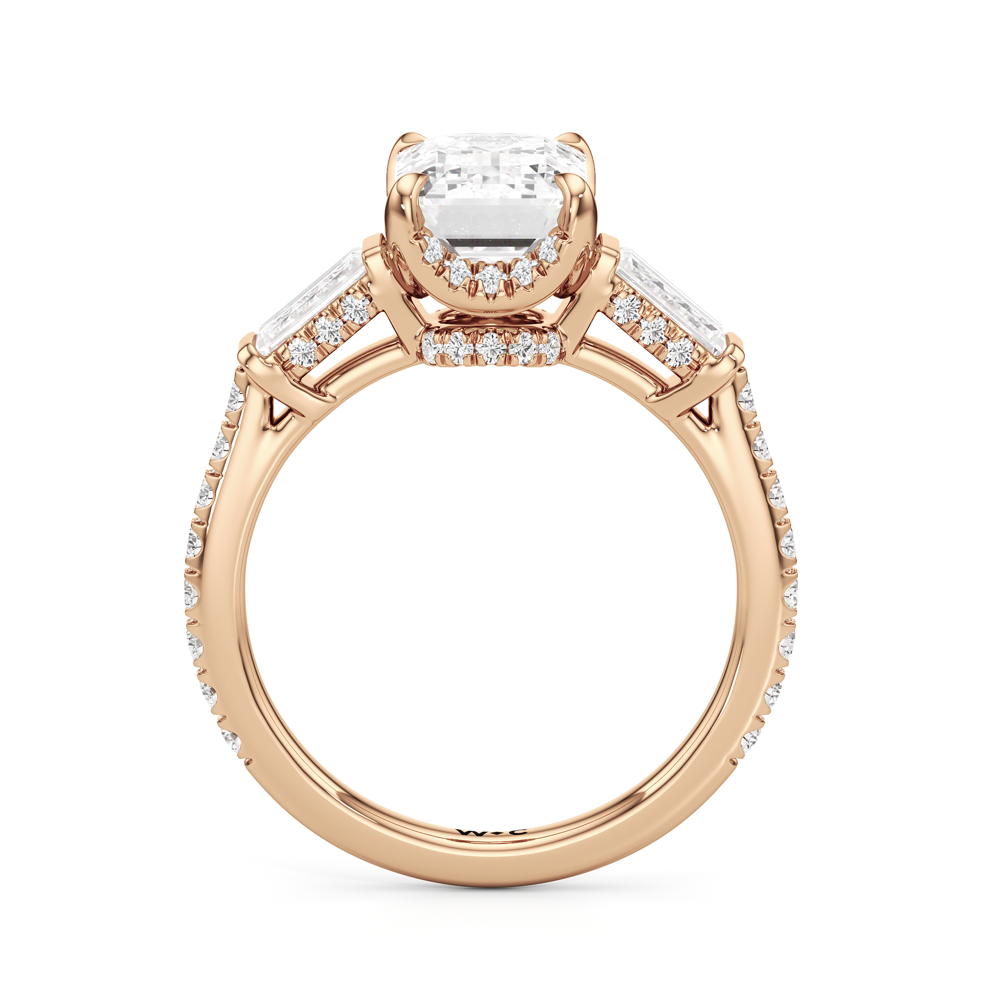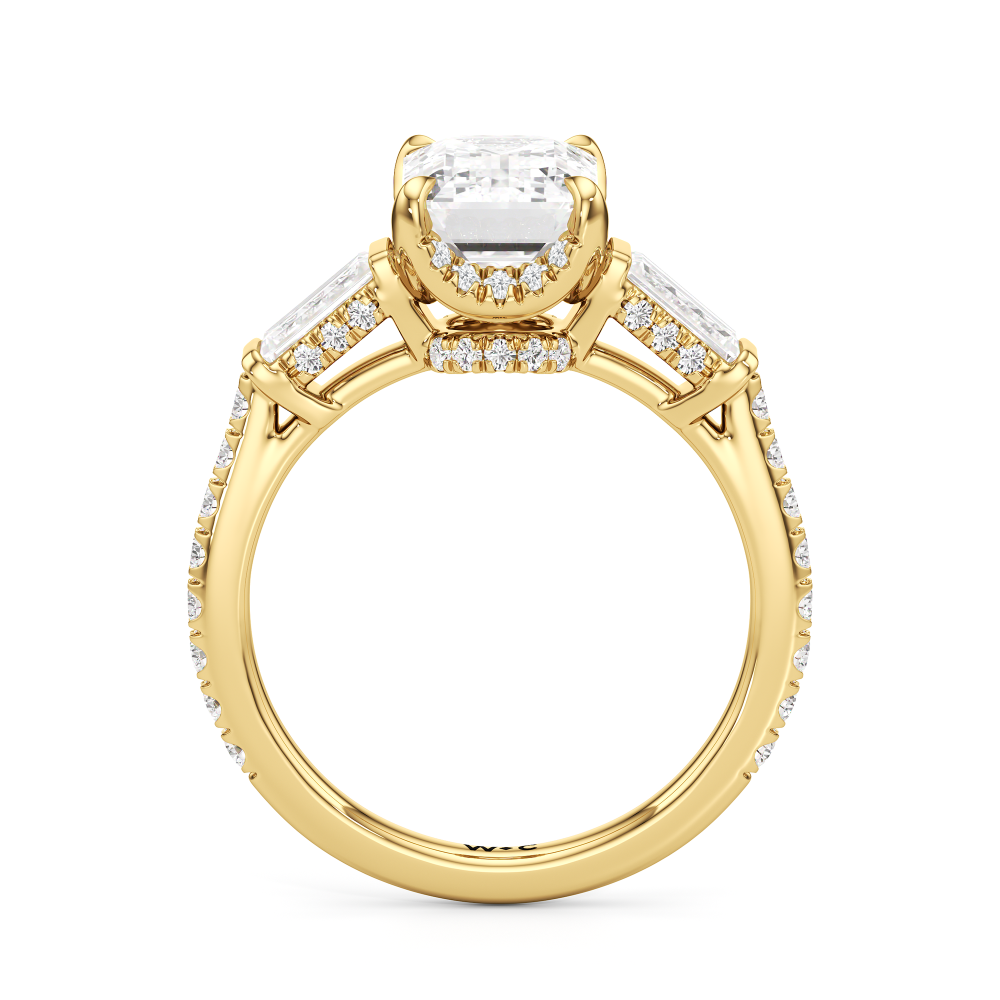 A contemporary classic. The ring reinterprets the traditional three-stone silhouette with a focus on sculptural grandeur. A center stone is held by four prongs and flanked by the sharp, mirrored flash of baguette diamonds. Secret rows of diamonds are tucked beneath each side stone and along the bridge. This hidden brilliance, paired with a diamond-set shank, ensures a continuous luster from every perspective.