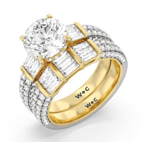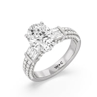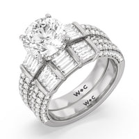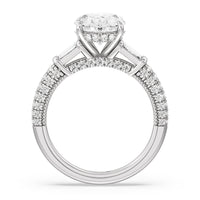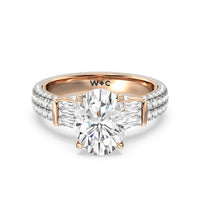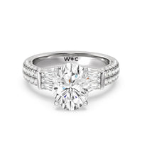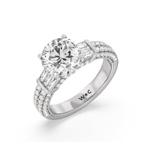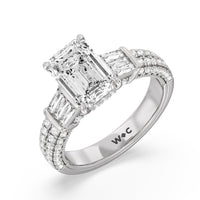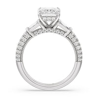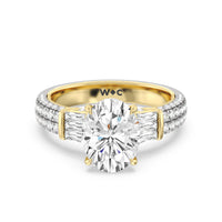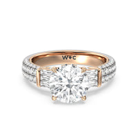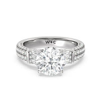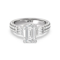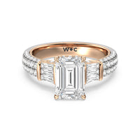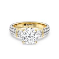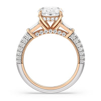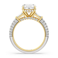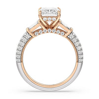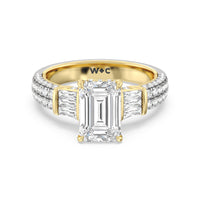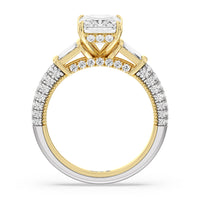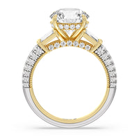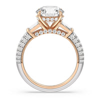 This two-toned engagement ring exudes Art Deco glamour with its symmetrical gemstone layout and rectilinear profile. The ring features baguette-cut diamond side stones in an east-west or horizontal setting. Two rows of diamonds run along the shank's shoulders. The ring is topped with a central diamond with a hidden halo for a truly glamorous effect.