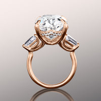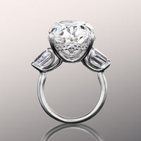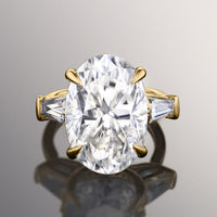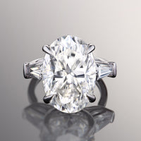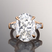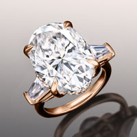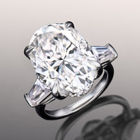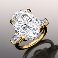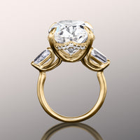 Daring in detail, uncover design with an elegant blend of lines and curves. This avant-garde three-stone ring boasts a beautiful harmony of contrasts. It has a brilliant oval diamond center stone flanked by tapered baguette diamond side stones that offer a mirror-like shine. The main gem is embraced by an undulating ribbon of petite round diamonds. All three stones are mounted on a u-shaped prong basket, that make for an incredibly striking yet timeless ring.