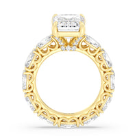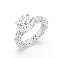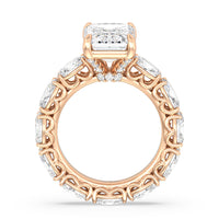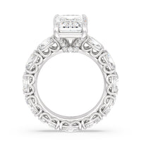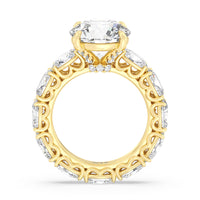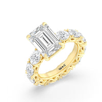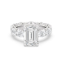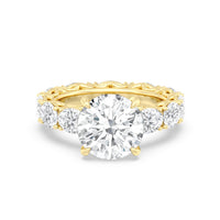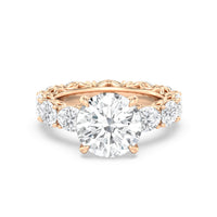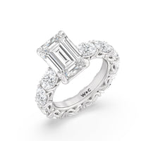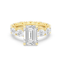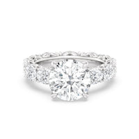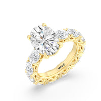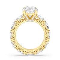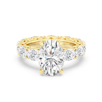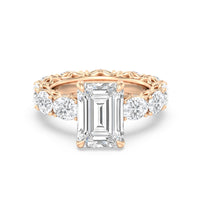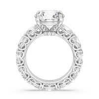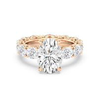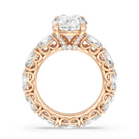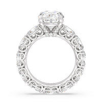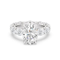 This engagement ring glitters effortlessly, mirroring the permanence of your love. The ring can be customized with your preferred cut of diamond for the center stone. The central gem comes cradled by a claw prong setting, with the prongs meticulously traced by petite round diamonds. A trio of diamonds dot the base of the center stone's setting for a touch of unexpected sparkle. The shank is encircled by smaller oval diamonds.