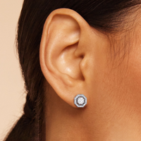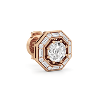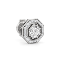 Geometric precision and visual harmony are qualities central to Art Deco movement's visual language, and they're clearly evident in this pair of stud earrings. Each earring features an octagon-cut center stone cradled by an eight-sided frame that embraces symmetry. The frame is adorned with alternating baguette and round stones, set within pavé walls and finished with delicate milgrain beading. The octagonal silhouette of these studs demonstrates sculptural sophistication, reflecting the Art Deco commitment to refined opulence.
