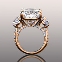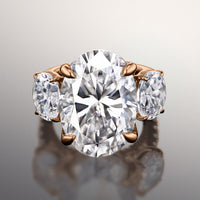 An utterly magnificent three-stone ring with intricate detailing. This ring holds an oval diamond center stone in between two oval diamond side stones. Each of the three main gems is securely cradled by a four-prong basket setting. Petite round diamonds are meticulously applied on the band's shoulders, bridge, and gallery for a dramatic and rhythmic play of light.
