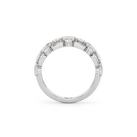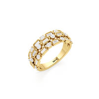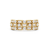 Three rows, two diamond cuts, one band that is sure to shine in any setting. Refinement and versatility go hand in hand to make this ring worthy of a spot in your daily rotation. It features alternately-set baguette and round diamonds, styled in triple rows to create a stacked look that is powerful yet poised.