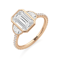 A ring with a distinct character. It bears two half-moon diamond side stones, each sitting on the center diamond's left and right sides. At the base of the central stone is a hidden diamond halo with decorative arms that extend to the side stones. The band's sloping shoulders are also lined with petite round diamonds for a continuous shine. Each of the three stones that form the centerpiece is mounted on a bezel setting, which provides optimum stability, making this trilogy ring perfect for someone who leads an active lifestyle.