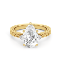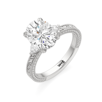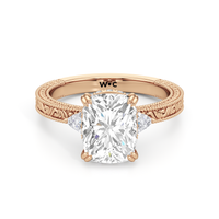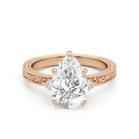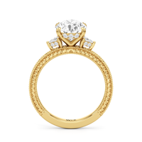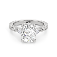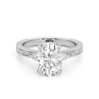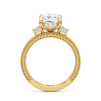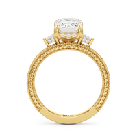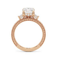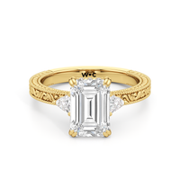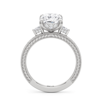 Rooted in Shakespearean lore, Ophelia glows quietly with sentiment. This extraordinary three-stone ring features trilliant-cut diamond side stones and intricate engraving along the band. The center stone's double prong setting with hidden halo draws inspiration from antique heirlooms, yet its crisp execution speaks to modern craftsmanship. Ophelia is not just a ring. It is a statement piece of both scale and sophistication, romance and melancholy.