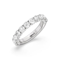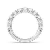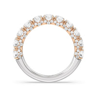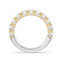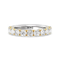Designed in equal parts feminine and glam, this diamond anniversary ring will once again sweep your beloved off her feet. The ring features a two-toned construction, with the band in a different metal color than the stylish U-shaped prongs. Round diamonds line half of the band's circumference, complemented by petite round diamonds that trace the sides of the U-shaped prong baskets.