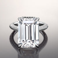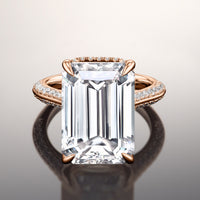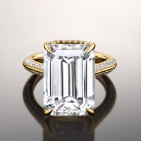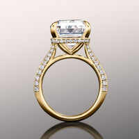 Revel in remarkable understated elegance. This design embraces a central emerald-cut diamonds, cradled by four prongs and embraced by a glistening hidden halo. The centerpiece is supported by the tapering shoulders of a knife-edged cathedral shank encrusted with pavé-set round diamonds that are designed to conjure awe, offering a beautiful way to express the boundless depth of your love.