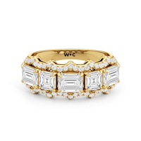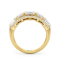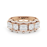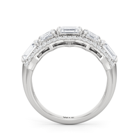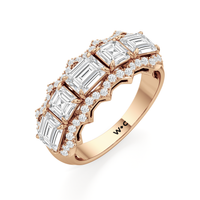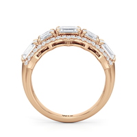 The Pine Ring presents a design rooted in the architectural pulse of steel and glass of 1920s Manhattan. It features five step-cut diamonds—alternating Asscher and emerald cuts—set across nearly half of the band. Each diamond is held securely by claw prongs and is cradled beneath scalloped arches dotted with petite round diamonds that sparkle like streetlights against a midnight sky. Indeed, a graceful tribute to the stunning metalwork that adorns New York's most iconic landmarks.