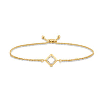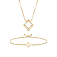 The geometric charm of this minimalist jewelry set makes for a memorable present. The Princess Set includes a bolo bracelet and necklace pairing, with each jewelry piece adorned with a square-shaped motif. Diamonds elegantly trace the inner edges of each square frame. This set is ideal for someone who prefers easy, effortless jewelry.