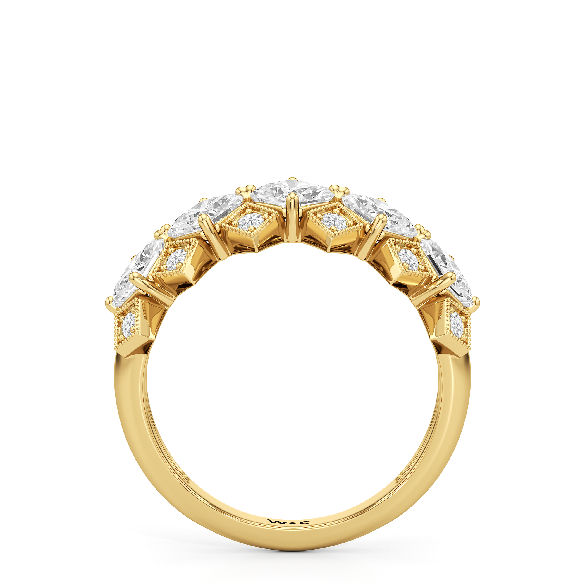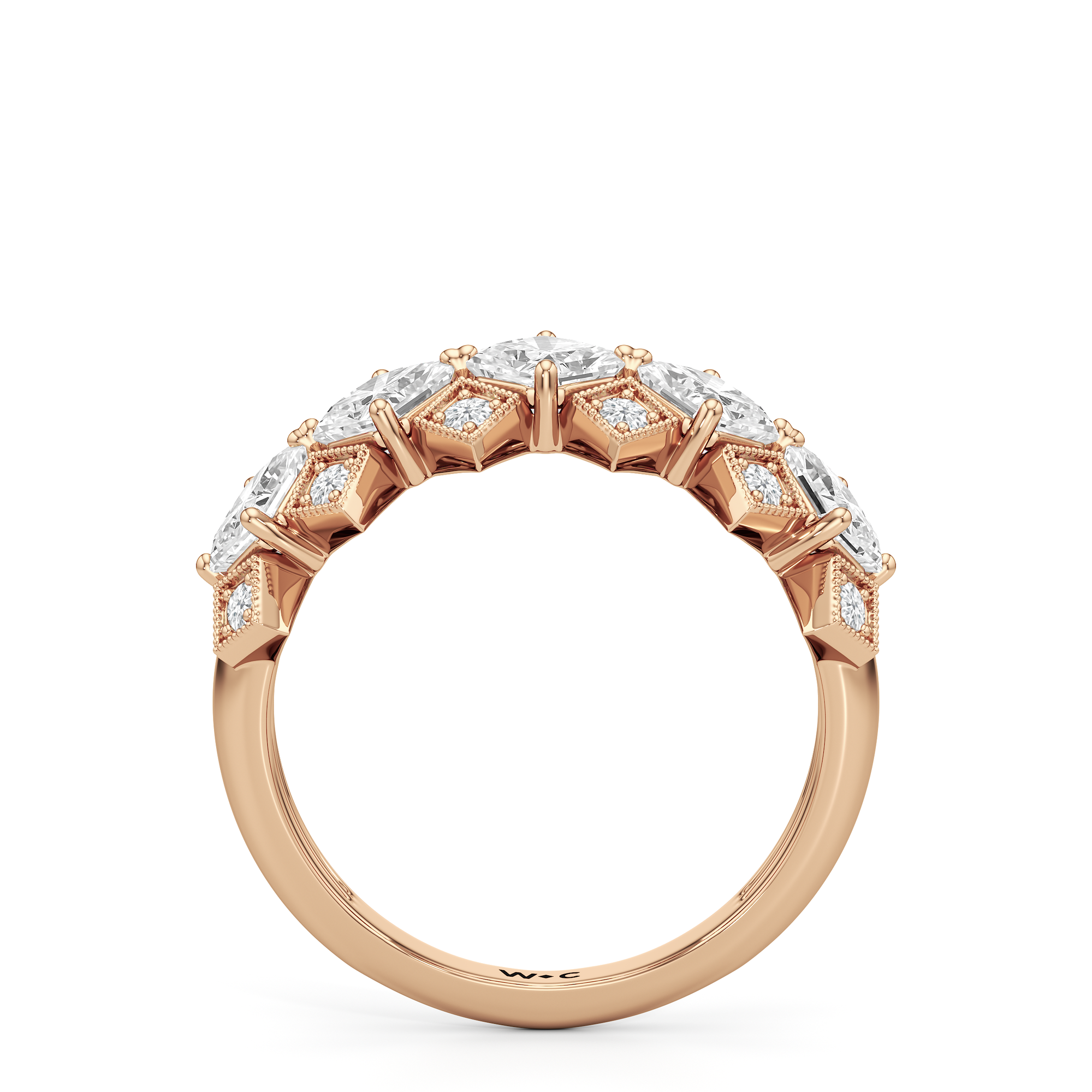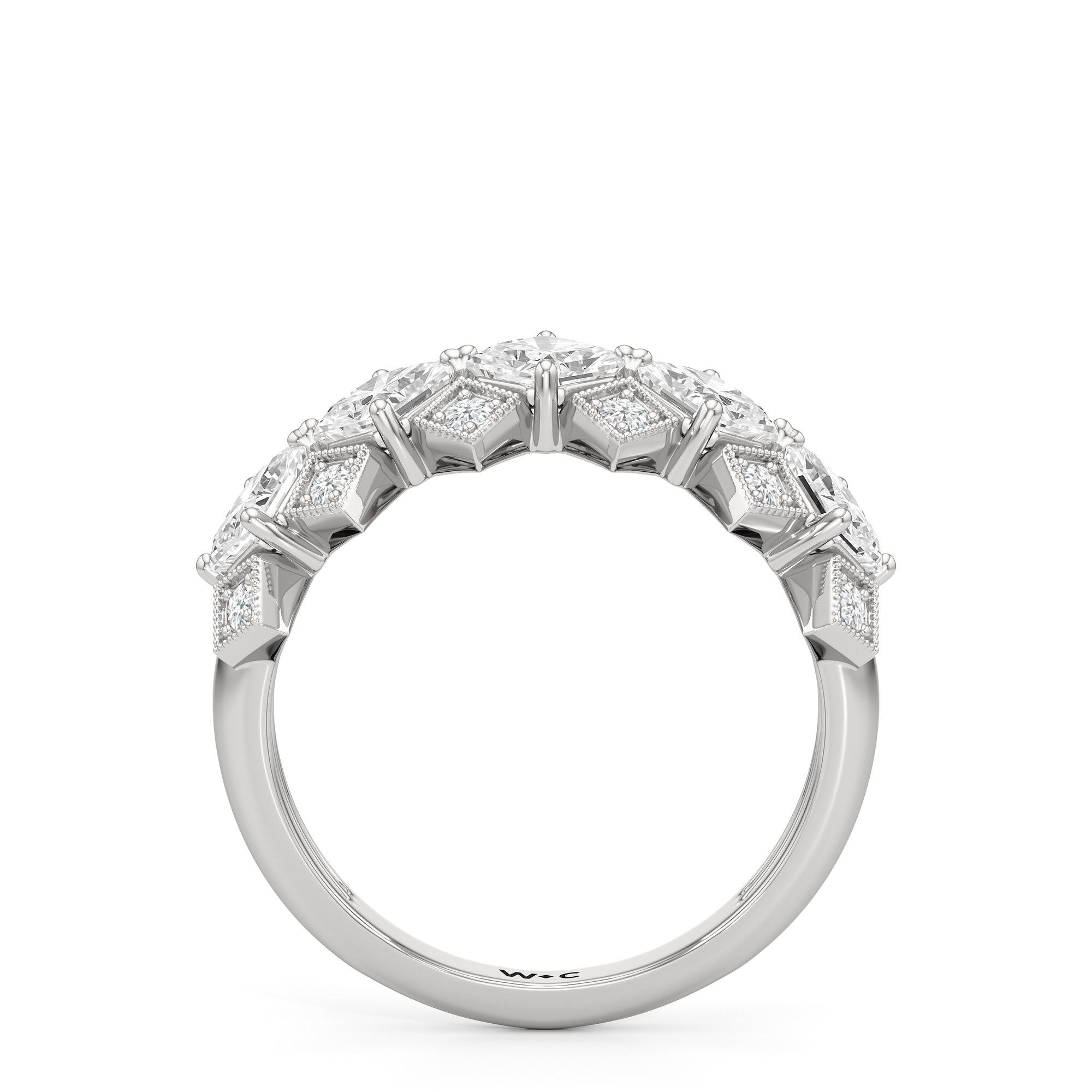 In Art Deco architecture, metalwork is a key design feature that reflects the movement's fascination with structure and symmetry. Here is a ring that calls to mind the bold yet harmonious fusion of shapes and linear forms, interplayed with light to allow brilliance to emerge from every angle. This anniversary ring boasts the fusion of Asscher-cut diamonds and round diamonds in micro-pave setting, elegantly presented in a grille-like pattern to capture the intricate metalwork seen on the lobby of the world's most magnificent Art Deco skyscraper, the Empire State Building.