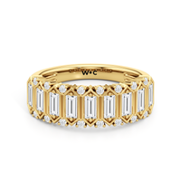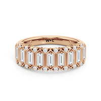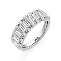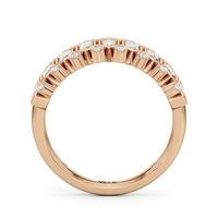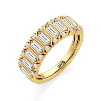An anniversary ring, the Reynolds Ring is a half-eternity band that captures the daring geometry and futuristic vision of Art Deco. Prong-set baguette diamonds cover half of its circumference, each mounted on a hexagonal frame. The geometric pattern and the facets of the diamonds echo the strong vertical lines and highly polished metalwork featured on the main entrance of the Chrysler Building in New York City, an iconic Art Deco skyscraper first envisioned by American real estate builder and politician William H. Reynolds. Round diamonds mark each point of the zigzag edge, evoking Art Deco's fascination with perpetual motion and streamlined elegance.