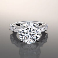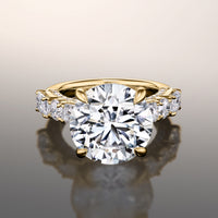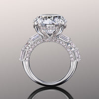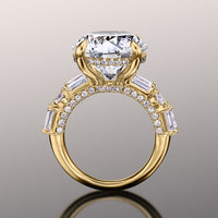 A mystical, visually intriguing ring for design rich in detail. Featuring a brilliant round diamond center stone that draws your gaze and leaves you in awe. The mesmerizing center stone is nestled on four prongs, with a sophisticated hidden halo. The band's shoulders hold a trio of diamonds - two emerald-cut diamonds on each side, with a round diamond in between. Petite round diamonds line in a semi-circle on the ring's gallery for an even brighter shine.