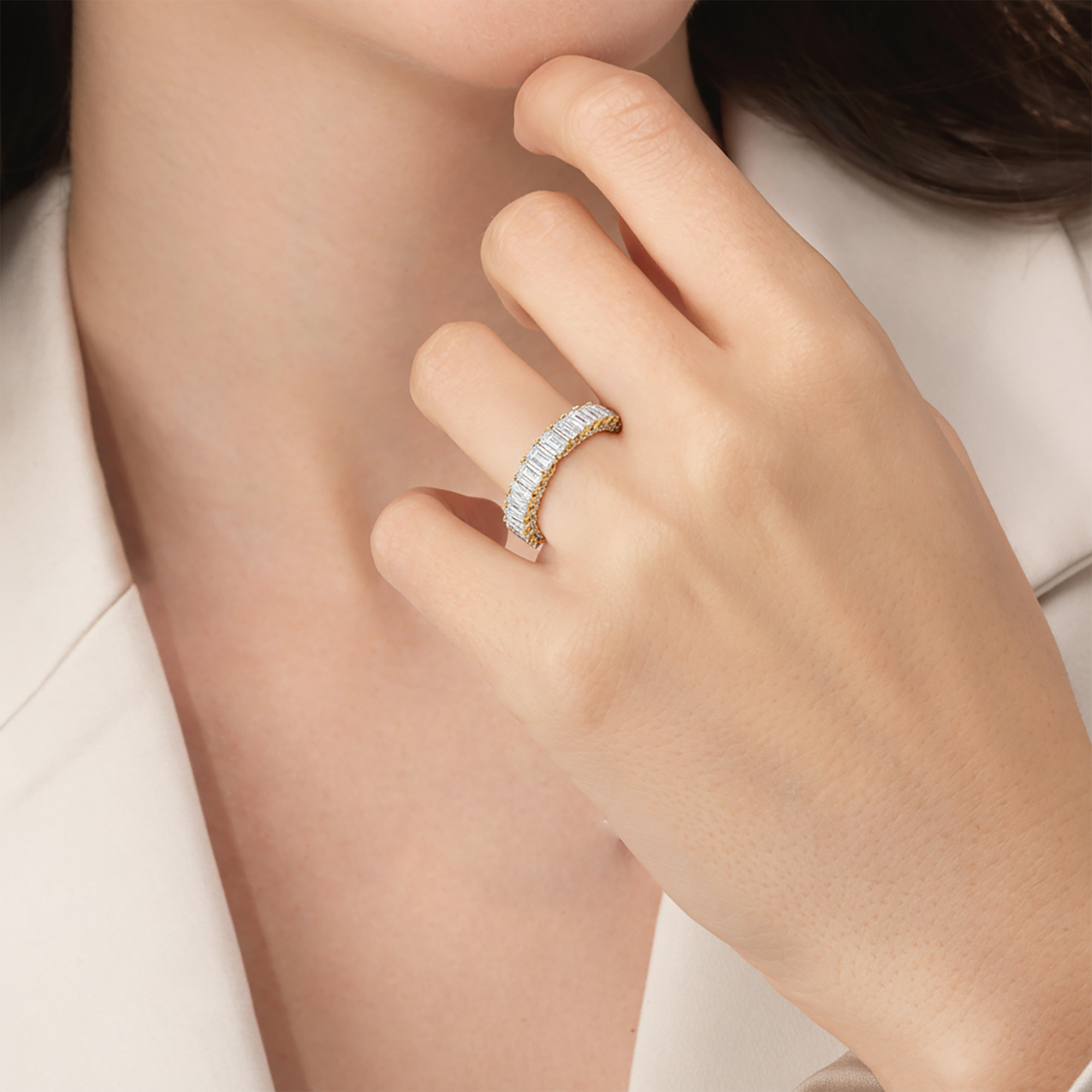 Shimmering pave diamonds cascade down this band to create a timeless beauty that will never go out of style. Designed to be paired with our ‘the roosevelt emerald ring’ for a simple and sophisticated look.