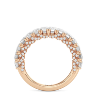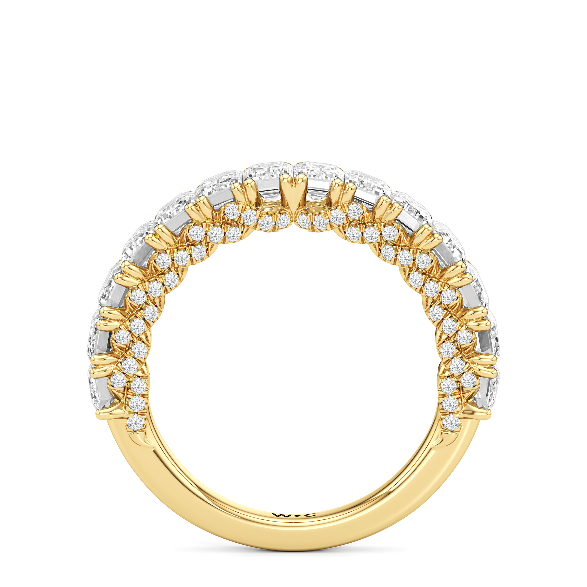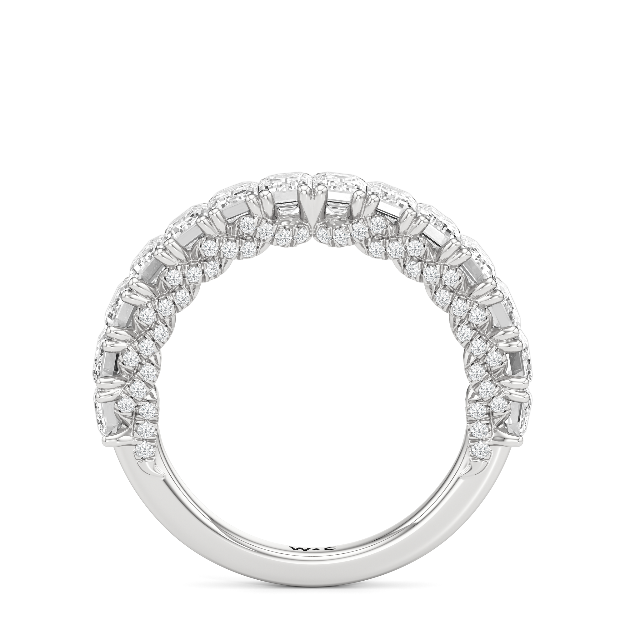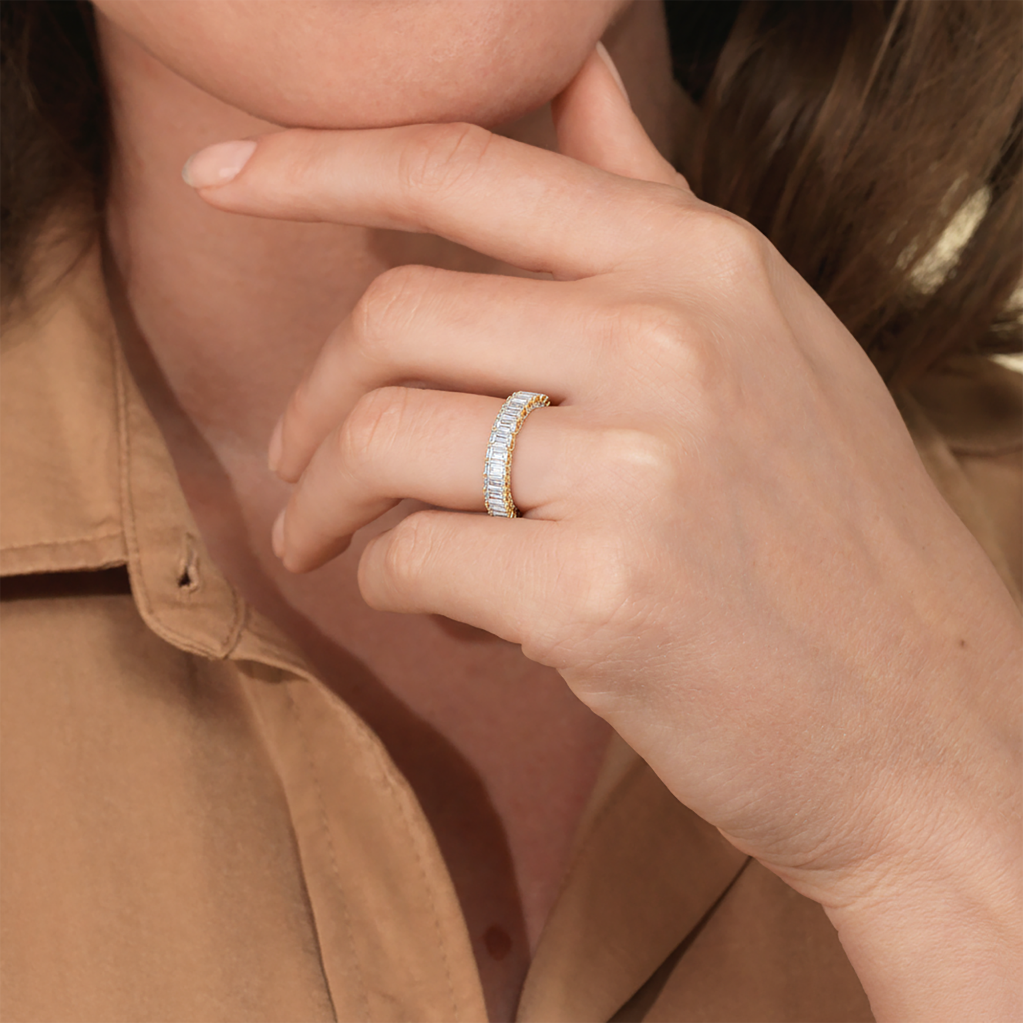 Shimmering pave diamonds cascade down this band to create a timeless beauty that will never go out of style. Designed to be paired with our ‘the roosevelt three stone trapezoid ring’ for a simple and sophisticated look.