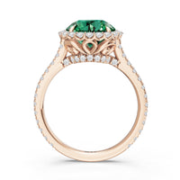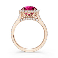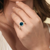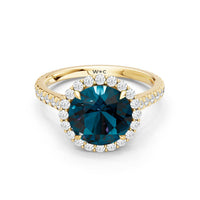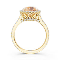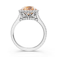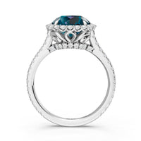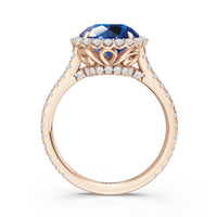 Soft as moonlight on still water, the round blue sapphire shimmers at the center of this ring. A halo of diamonds surrounds its soft blush, while a filigree gallery beneath lifts the design, guiding the eye to its graceful allure. Diamonds along the bridge and shank trace the ring's curves, harmonizing with its serene presence.