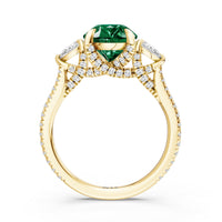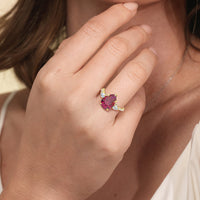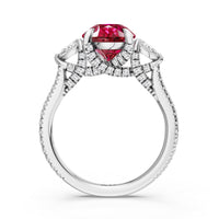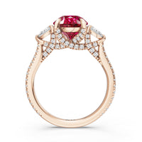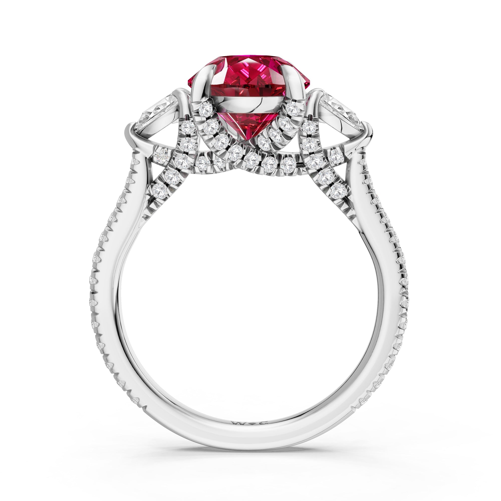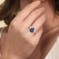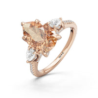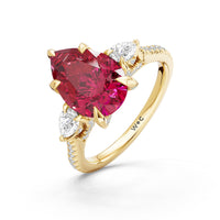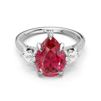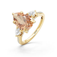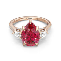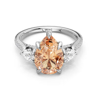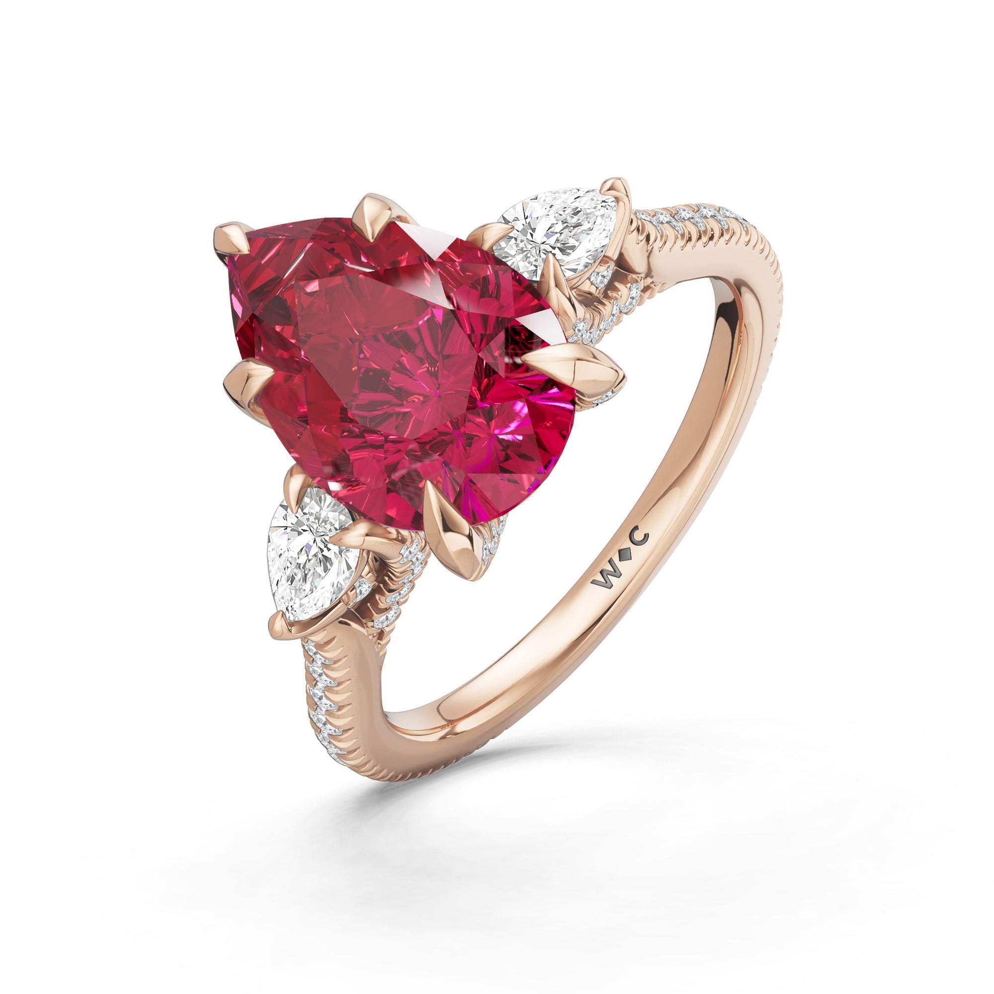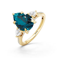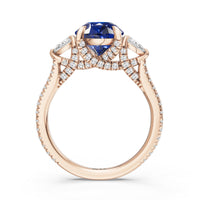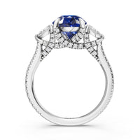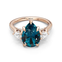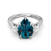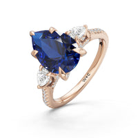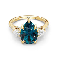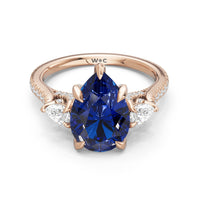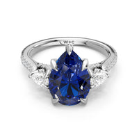 Flanked by east-west pear diamonds, a pear-shaped blue sapphire stretches north to south, creating a dynamic contrast of orientation. The trio of stones is lifted by a diamond-studded trellis, where angles and curves intertwine like a delicate vine in motion. A pavé shank completes the graceful design.