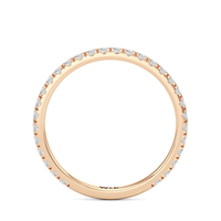 A refined pavé wedding band designed to pair seamlessly with Rose’s solitaire profile. Diamonds wrap nearly the full circumference of the band, creating an uninterrupted line of brilliance in a clean, classic silhouette.
