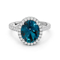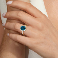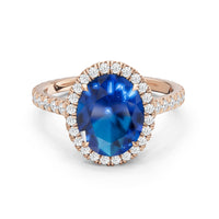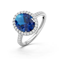 Every detail of this ring flows with feminine grace. The oval blue sapphire, cradled within an ornate basket, is surrounded by a brilliant halo. More diamonds trace the band, weaving light along its curves and creating a subtle choreography of structure and radiance.