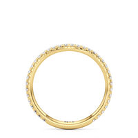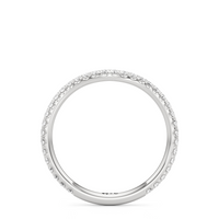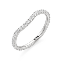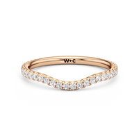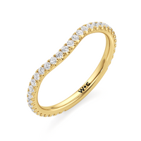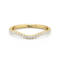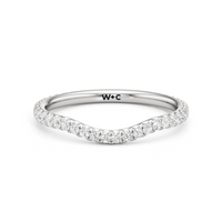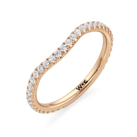 This curved diamond set wedding band is perfectly contoured to complement our the scarlett three stone engagement ring for a simple and sophisticated look.