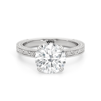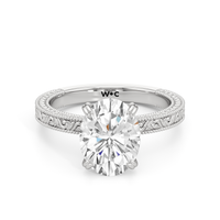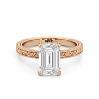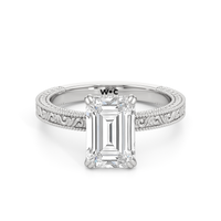 Seraphine calls to mind baroque opulence and royal lineage. Fiery, intricate, and commanding, this diamond ring stuns with its pavé shank, hidden halo, and double prongs that frame the center stone with strength and elegance. Flourishes of engraving add depth and detail, drawing the eye, then refusing to let go.
