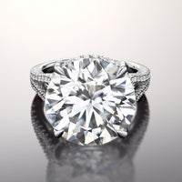 Capture the heart of a true romantic. This design presents a mesmerizing round diamond center stone. The sizeable carat weight of the incredibly brilliant centerpiece is complemented by the eye-catching glitter of petite round diamonds that trace the split shoulders of the shapely cathedral shank. A hidden halo and a diamond-encrusted trellis bring added elegance to the ring, infusing it at once with a sense of opulence and refinement.