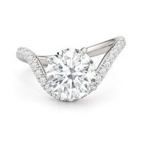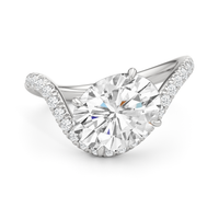 An central diamond held in an elegant curve, traced by more diamonds. Artful and asymmetrical, this ring stuns with quiet confidence.
