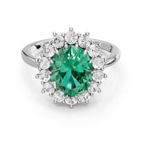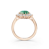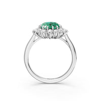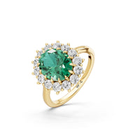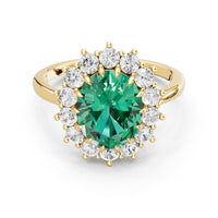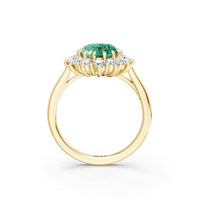 A blue sapphire in oval shape rises in a multi-prong setting, framed by a halo of delicate diamonds. The cathedral shank lifts the colored gem with grace, letting light trace every curve. Inspired by a royal legacy, this engagement ring carries a princess' noble charm.