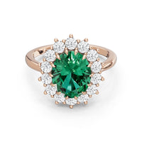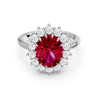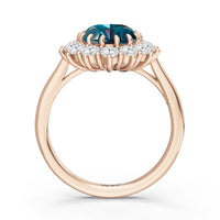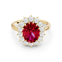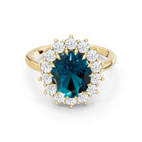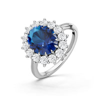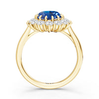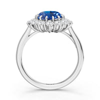 A blue sapphire in oval shape rises in a multi-prong setting, framed by a halo of delicate diamonds. The cathedral shank lifts the colored gem with grace, letting light trace every curve. Inspired by a royal legacy, this engagement ring carries a princess' noble charm.