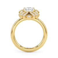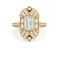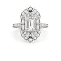 A ring that reflects the transition from Art Nouveau to Art Deco, this ring features a combination of graceful fluidity and sleek, streamlined forms. Its design is in early Art Deco architecture, with curved outlines softening the sharp geometry of the step-cut centerstone and side stones. The curved silhouette of the band and the centerpiece, detailed with milgrain borders and traced by round diamonds, shows how ornamental charm can be seamlessly fused with architectural precision.