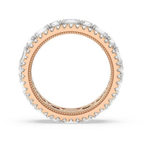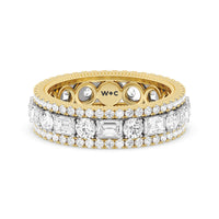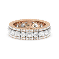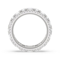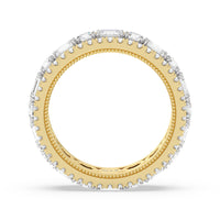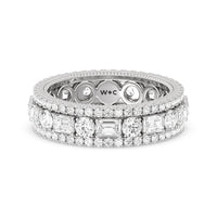 A bold and luxurious ring fit for a glamorous lady. This diamond eternity ring features alternating round and emerald-cut diamonds bordered by petite round diamonds on micro-prongs. A subtle milgrain detail traces the inner circumference of the shank for that elegant vintage flair.