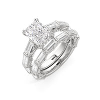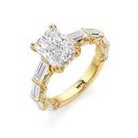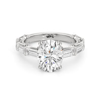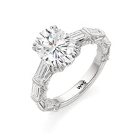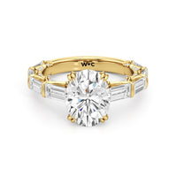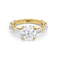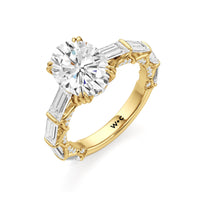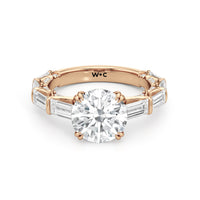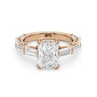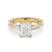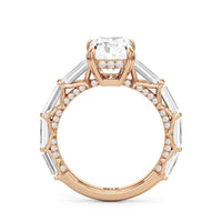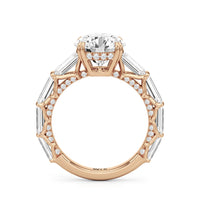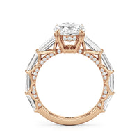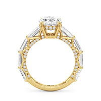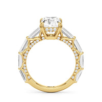 Bold and theatrical. The ring features a center stone on four double-claw prongs, anchored by a shank of bar-set baguette diamonds that trace more than half of the band. Sweeping curved V accents add a sense of movement to the profile, while petite diamonds line the band's inner outline for a dramatic flash..