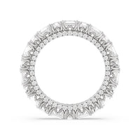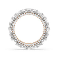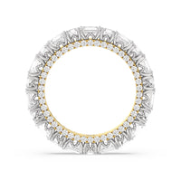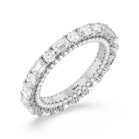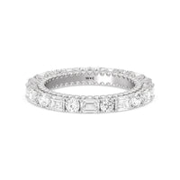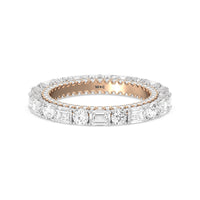 Remember the day you said "I do!" with this stunning eternity ring. It features a two-toned band. Running along the entire circumference of the ring are emerald-cut stones and round stones in alternating pattern. The sides is meticulously traced with petite round stones for that extra hint of brilliance.