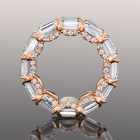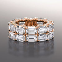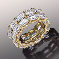 An opulent testament to grand design. This regal piece is fully embraced by two circular rows of emerald-cut diamonds. The never-ending shine truly doesn't stop for the band's edges are decorated with round diamonds meticulously mounted on a scalloped setting that make up the unmistakable charm of this ring.