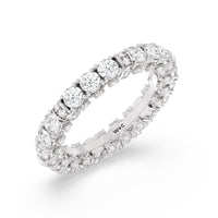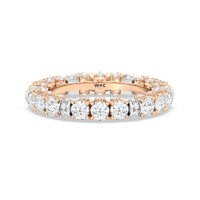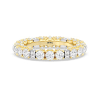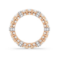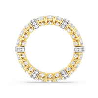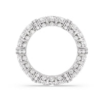 A dazzling eternity ring that captures attention and ignites envy. This brilliant piece features a never-ending shine. It features round diamonds spanning the whole circumference of the ring. The shimmering stones are set on decorative U-shaped prong baskets set in group of threes. Alternating each U-shaped prong trio is an arch of petite round diamonds. The view from the side reveals more petite diamonds punctuating each basket.