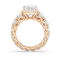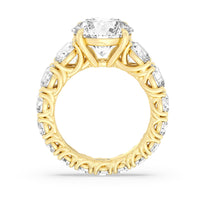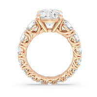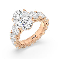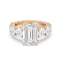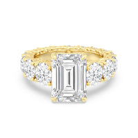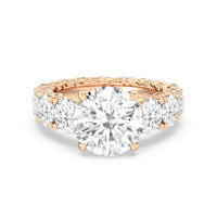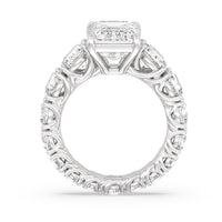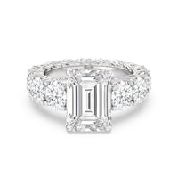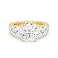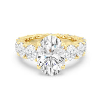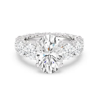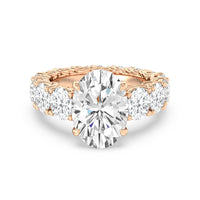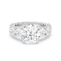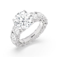 The perfect engagement ring to symbolize the never-ending love between you and your partner. This glittering band features a center stone in the cut of your choice - round, oval, or emerald. Running along the band's circumference are trellis-set round diamonds that taper in size as they reach the bottom of the shank. Fully covered with diamonds, this ring - like your love - exhibits brilliance from each angle.