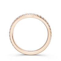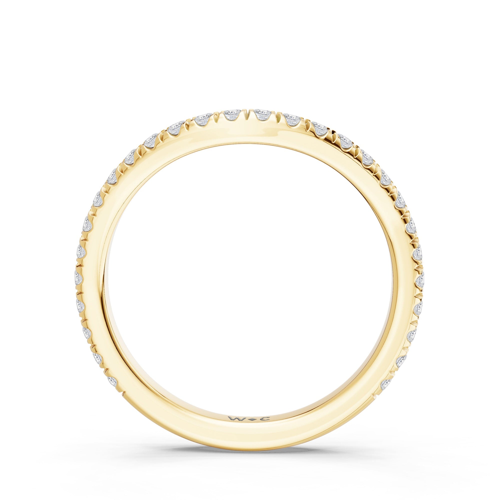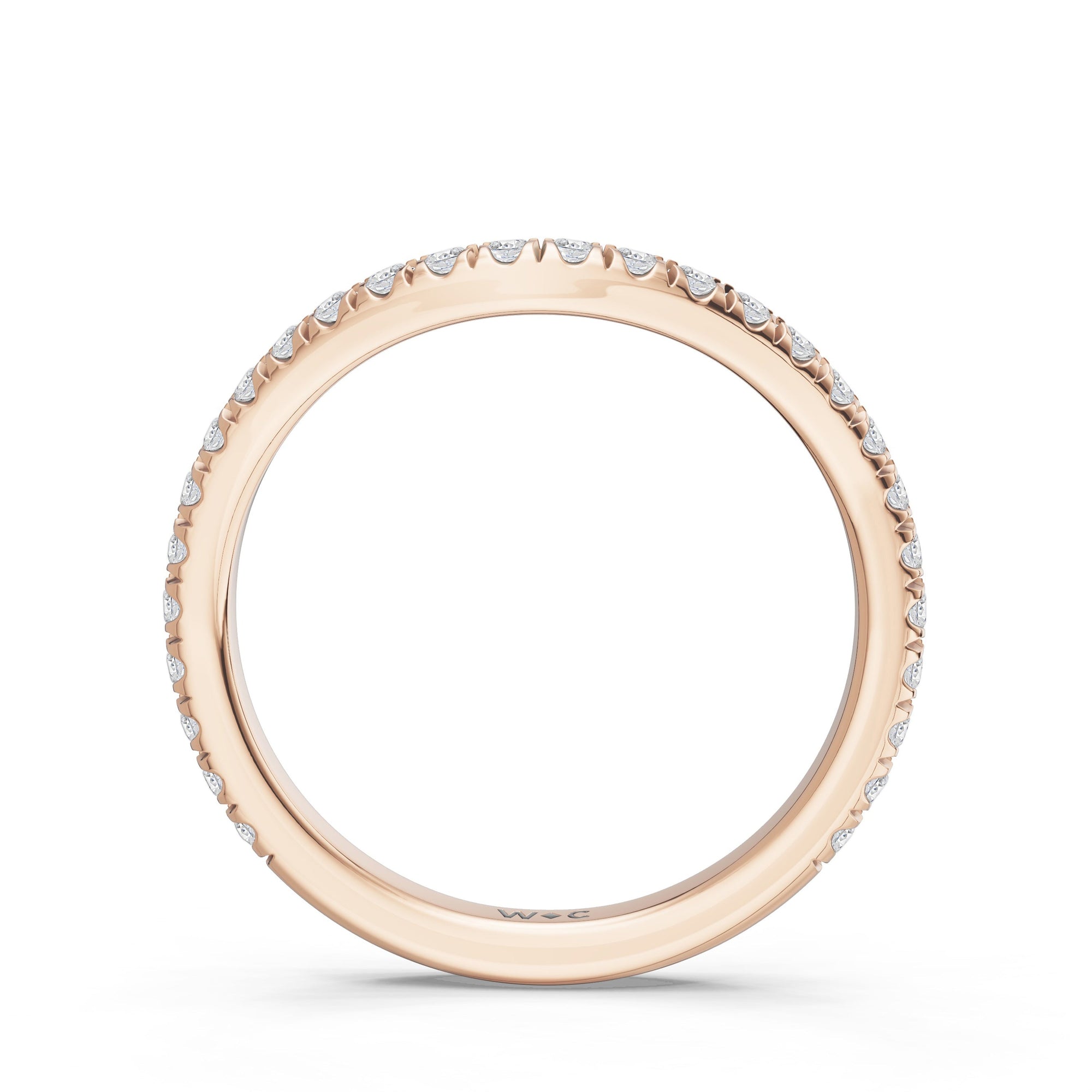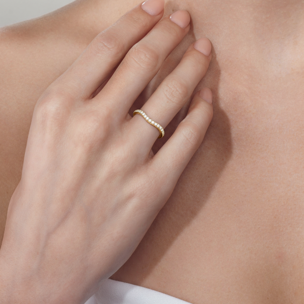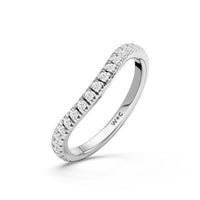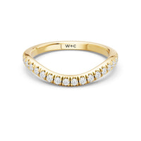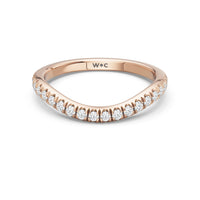 This curved diamond set wedding band is perfectly contoured to complement our the viridelle ring for a simple and sophisticated look.