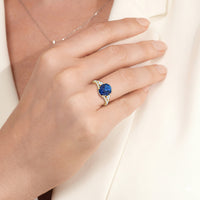 Four prongs hold an oval blue sapphire, framed by a hidden halo that glimmers softly. The diamond-traced cathedral split shank curves gracefully, with pear-cut side stones set along its sweep. The design, inspired by natural forms, is indeed a subtle reflection of verdant life.